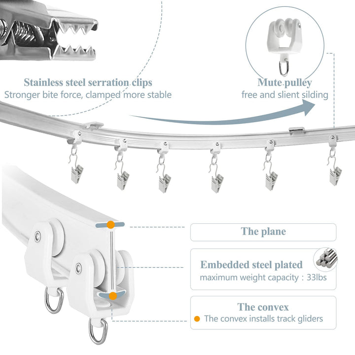 - MUTE SLIDE & CLIP TIGHTER -- Ceiling track for curtains feature superior rollers, lightweight but stronger weight capacity than ordinary gliders, slide smoothly and silently without disrupting sleep. More, curtain track clips are stainless steel with saw-tooth design, stronger bite force to clamp drapes firmly, don’t fall off.