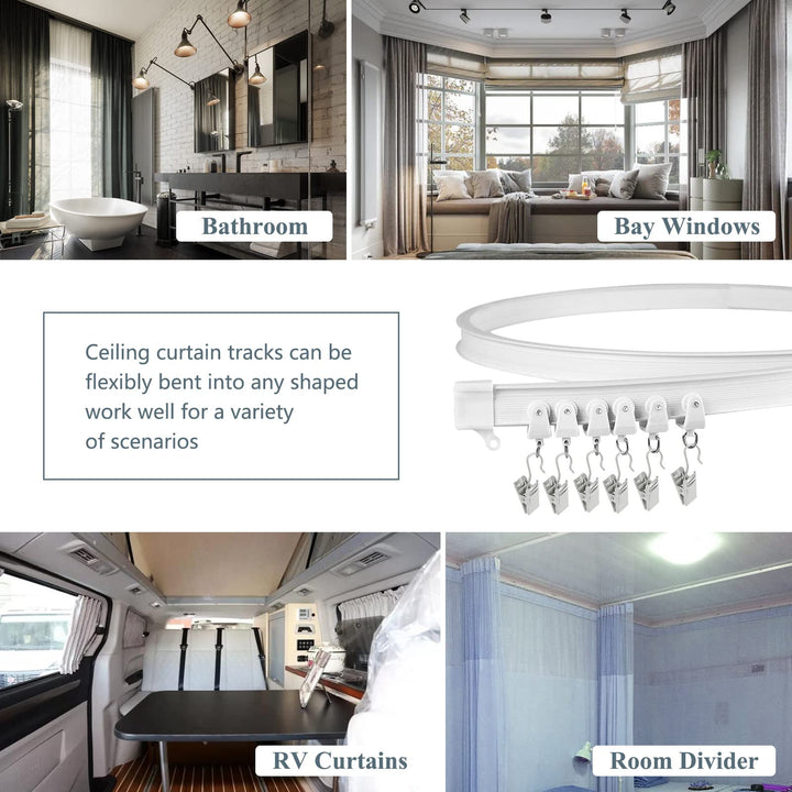 - WIDE APPLICATIONS -- Curtain track system can be bent and cut to fit any layout you dream up like L-shaped, rectangular, trapezoidal etc. Curtain track wall mount is great for room divider, bay window treatment, shower curtain track, RV, hospital, trailer, motorhome. Make the most of your space and gives you instant privacy.