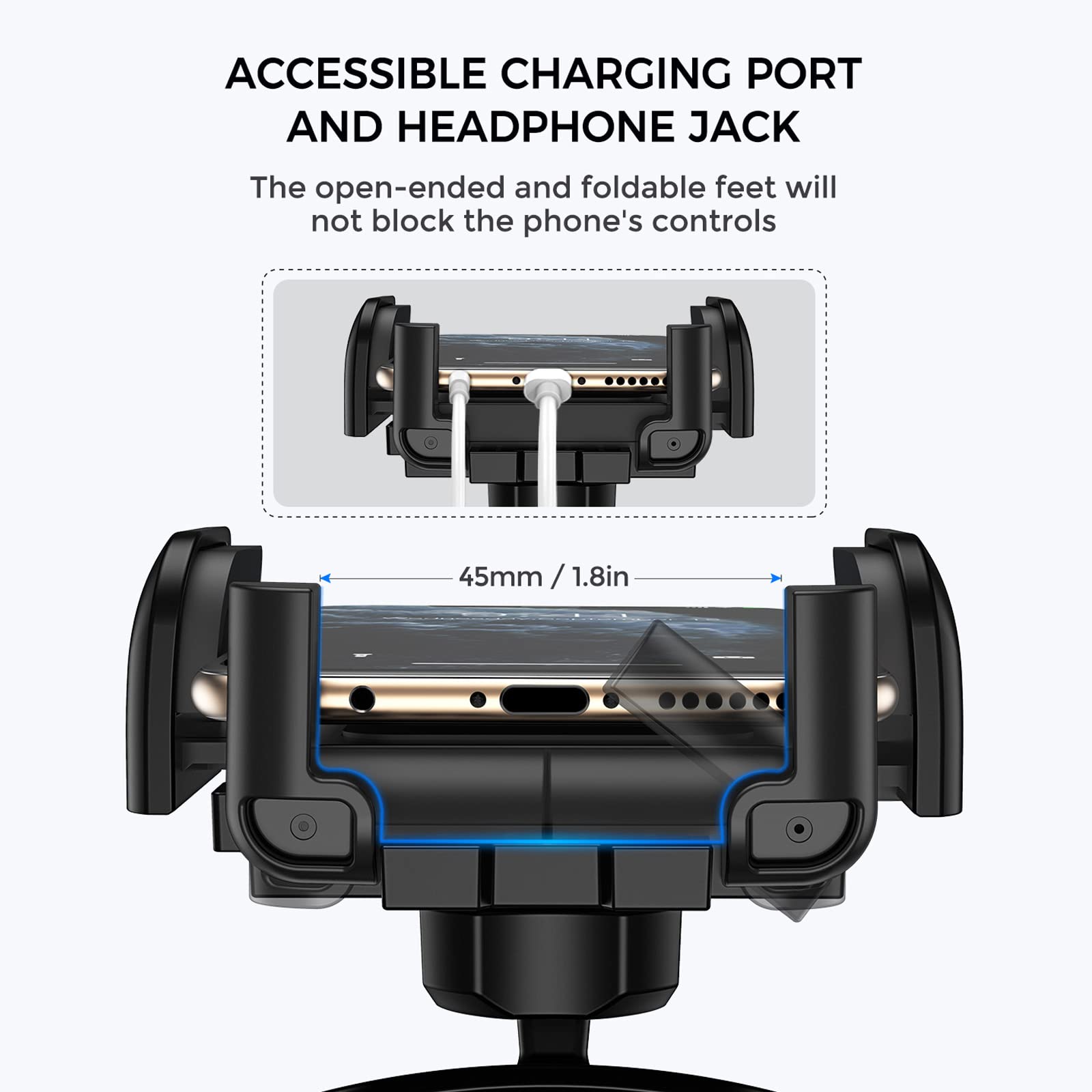 - One-Handed OperationThe CD player car phone mount only needs seconds to install in your car. The one-touch mechanism enables you to mount your phone effortlessly when you get in the car or remove it in one second when are ready to go exit your car. The foldable extra-wide supports never block the charging port, headphone input, and mic.
