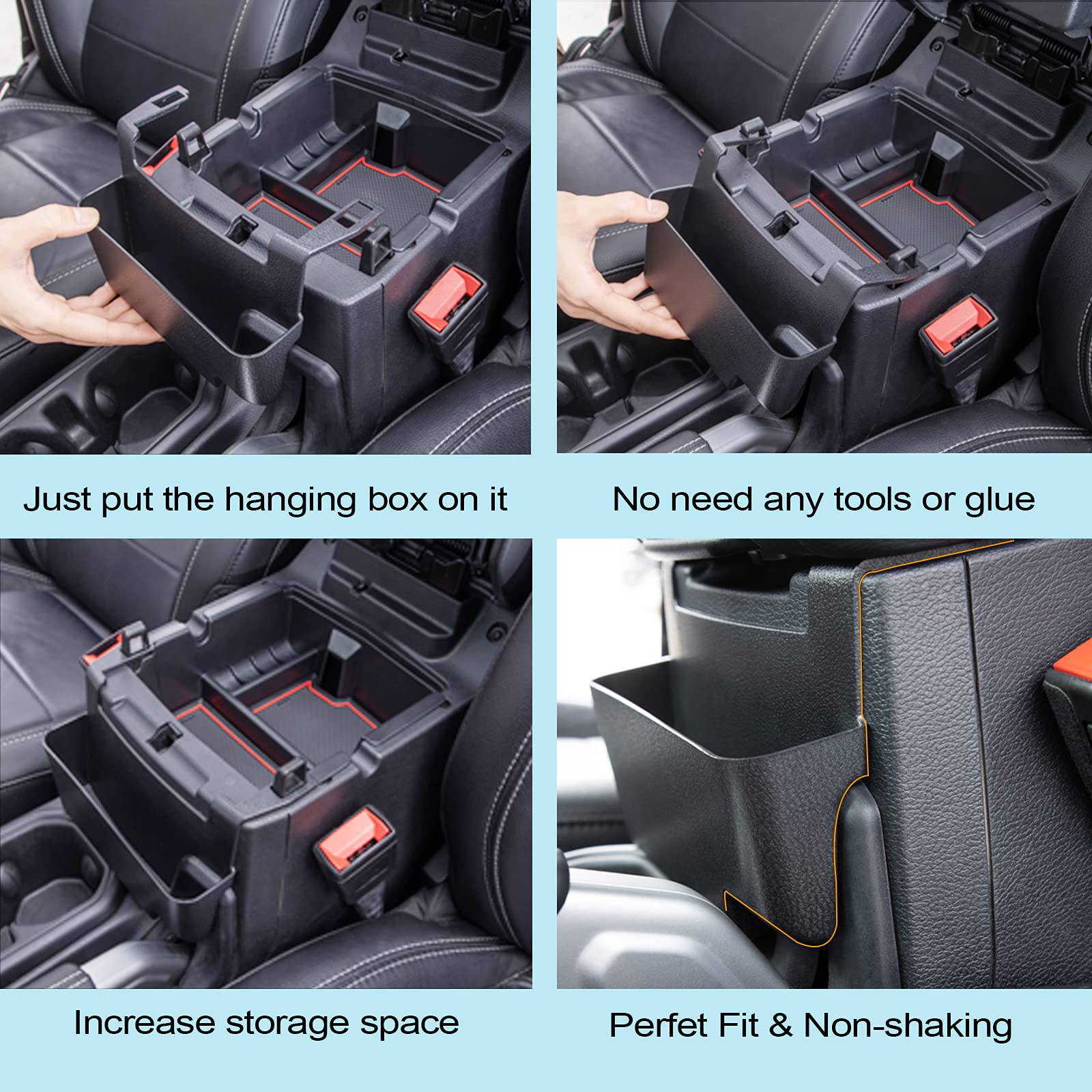 - [PATENT DESIGN]: Designed according to the interior with natural texture. Made of high-quality ABS material, it will not damage your original center console armrest box. The hanging box can withstand pressure and is very durable.