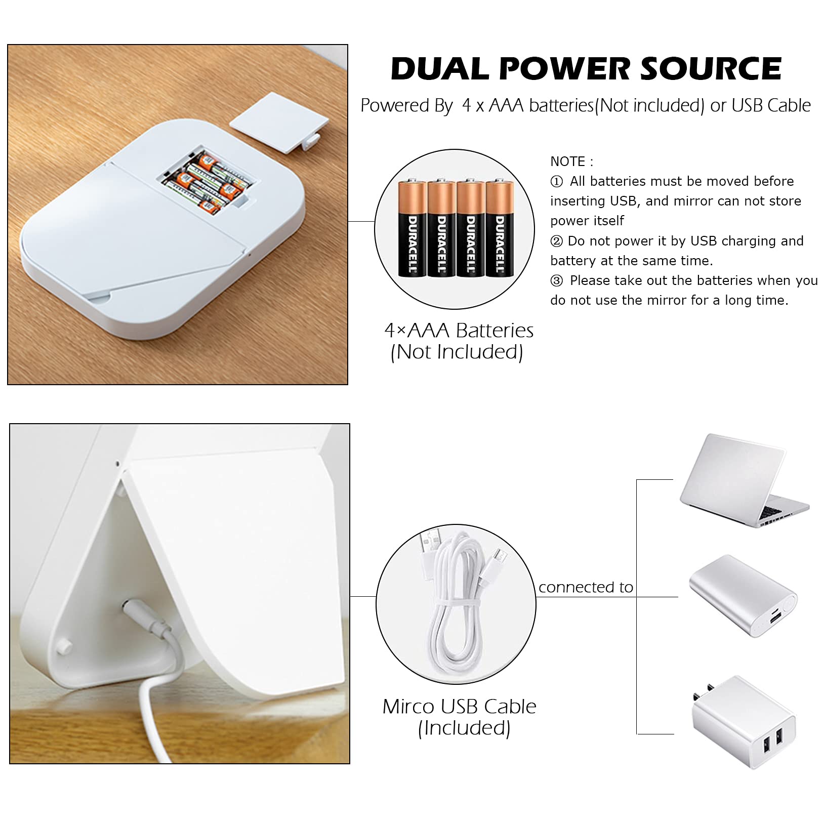 The Mirror with Lights is operated by 4X AAA batteries (not included) or USB cable (included).
