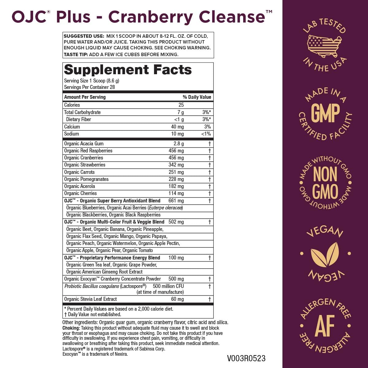 Designed for daily use, OJC Plus - Cranberry Cleanse serves up over 20 certified organic super fruits and antioxidant-packed berries to nourish your body.* Loaded with phytonutrients to support vibrant health, OJC promotes vitality and energy while also supporting your body's ability to cleanse by supplying 4 grams of fiber.* The addition of the clinically tested dose of 500 mg of Pacran Cranberry delivers dynamic benefits to promote healthy urinary tract function.