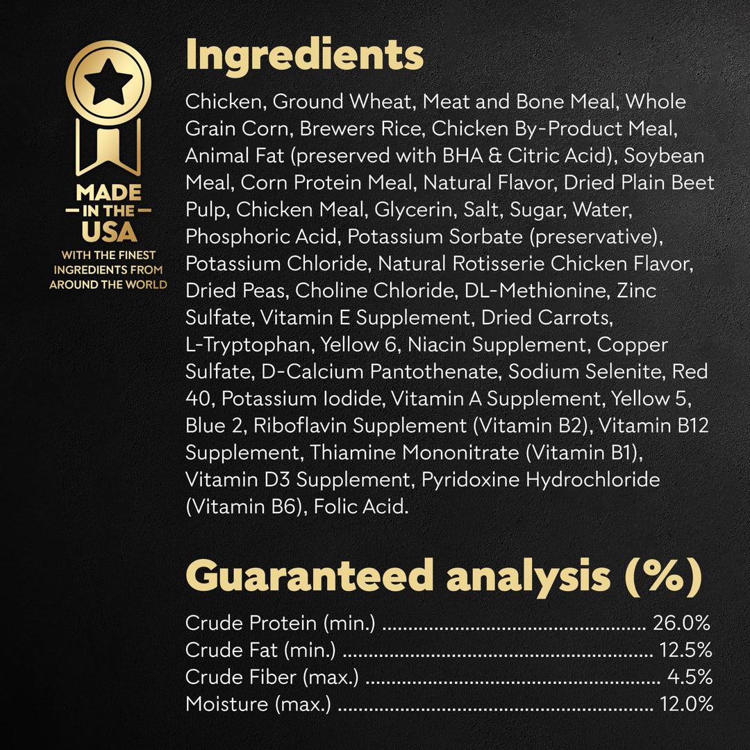 | ingredients | Chicken, Whole Grain Corn, Ground Wheat, Meat and Bone Meal, Brewers Rice, Chicken By-Product Meal, Animal Fat (preserved with BHA & Citric Acid), Soybean Meal, Corn Gluten Meal, Natural Flavor, Dried Plain Beet Pulp, Chicken Meal, Glycerin, Salt, Water, Sugar, Potassium Sorbate (a preservative), Phosphoric Acid, Potassium Chloride, Natural Rotisserie Chicken Flavor, Dried Peas, Calcium Carbonate, Choline Chloride, DL-Methionine, Vitamin E Supplement, Zinc Sulfate, Dried Carrots, L-Tryptophan, Yellow 6, Niacin Supplement, D-Calcium Pantothenate, Red 40, Copper Sulfate, Yellow 5, Sodium Selenite, Potassium Iodide, Vitamin A Supplement, Blue 2, Riboflavin Supplement (Vitamin B2), Vitamin B12 Supplement, Thiamine Mononitrate (Vitamin B1), Vitamin D3 Supplement, Pyridoxine Hydrochloride (Vitamin B6), Folic Acid. |