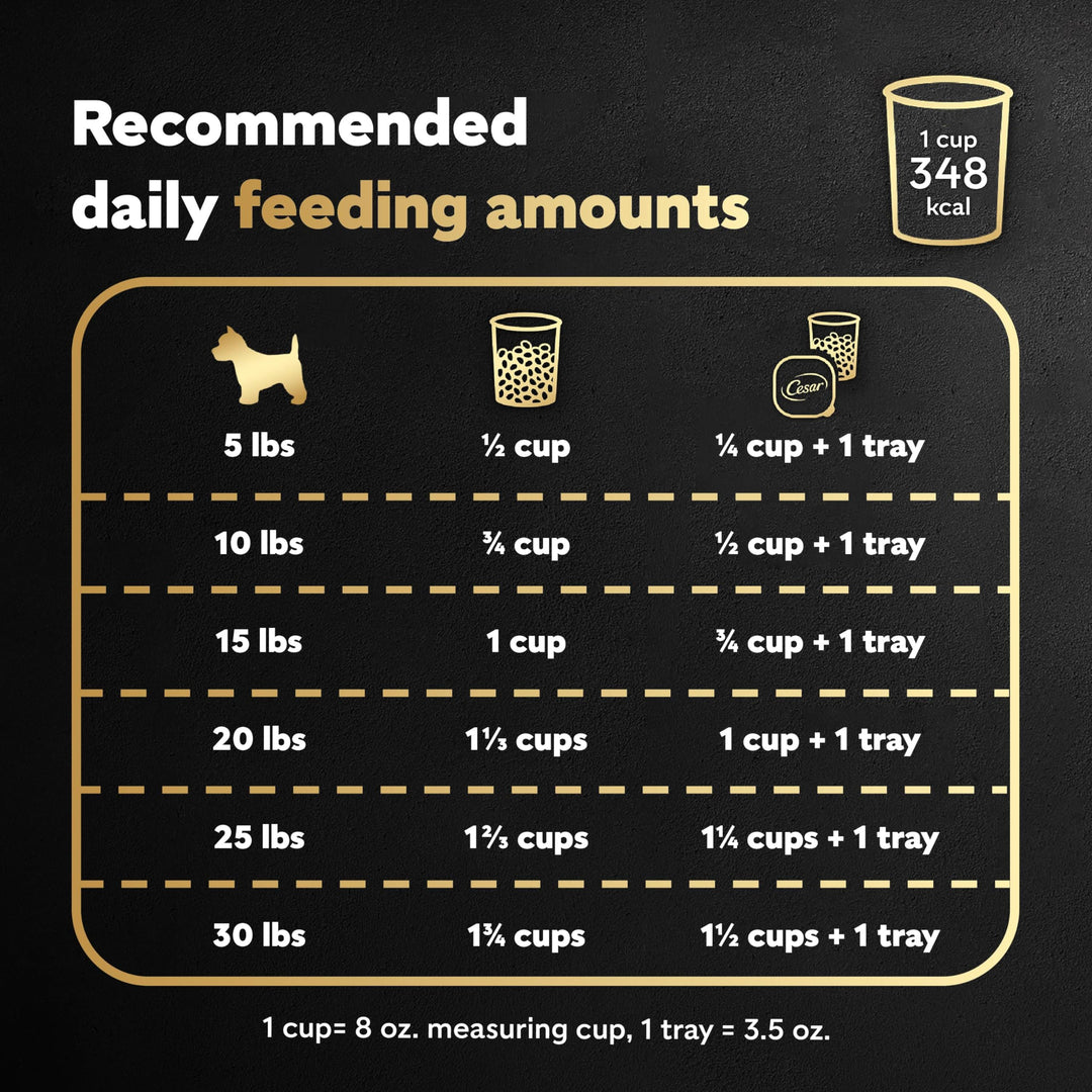 | directions | Recommended Daily Feeding Guideline for Adult Dogs* Dog Weight Feeding CESAR® Dry Only Feeding CESAR® Dry along with CESAR® Home Delights™ 5 lbs. 1/2 cup 1/4 cup + 1 tray 10 lbs. 3/4 cup 1/2 cup + 1 tray 15 lbs. 1 cup 3/4 cup + 1 tray 20 lbs. 1 1/3 cups 1 cup + 1 tray 25 lbs. 1 2/3 cups 1 1/4 cups + 1 tray 30 lbs. 1 3/4 cups 1 1/2 cups + 1 tray 1 cup = 8 oz. measuring cup, 1 tray = 3.5 oz. *An individual dog's requirements may differ from this guide Transitioning to Our Food Gradually mix in with current food over a 4 day period, increasing the amount of CESAR® Filet Mignon Flavor and Spring Vegetables Garnish each day. |
