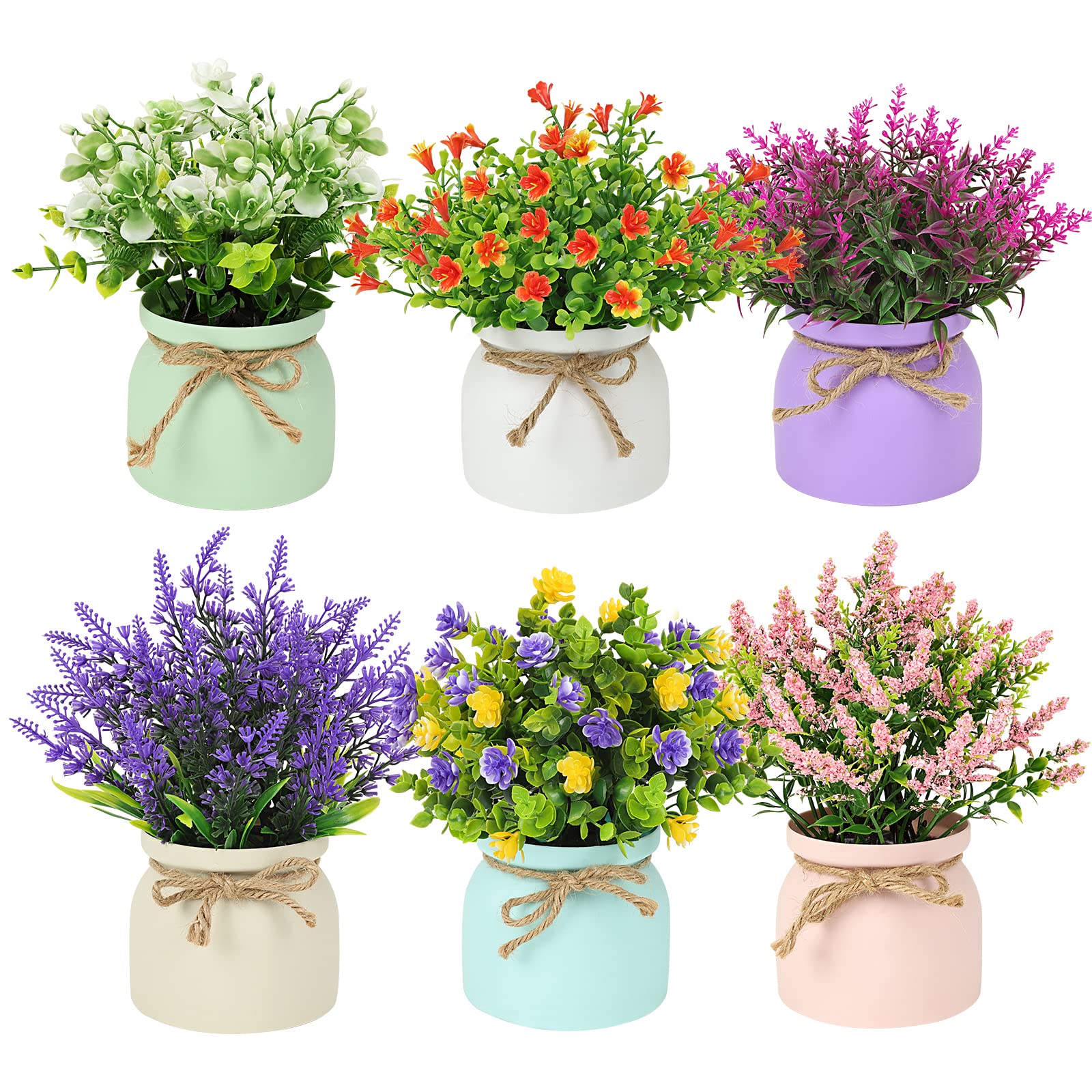 - [Package includes] 6 pots of farmhouse style small artificial potted plants, including artificial lavender, artificial boxwood, artificial eucalyptus and 6 other artificial flowers in various styles. All the flower pots are in macaron colors, with fake plants, they are very delicate and unique.