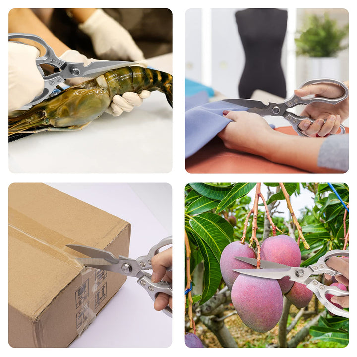 - 3CR14 Stainless Steel Sharp Blades High quality hardened stainless steel kitchen shears easily cut through cardboard, twine, food, meat, vegetables, chicken, poultry, fish, herbs, seafood, BBQ, food packing bags and more. Great as Food Scissors, Meat Scissors, Cooking Scissors, Scissors Kitchen, Cooking Shears, Poultry Scissors, Utility Scissors, Meat Cutting Scissors.