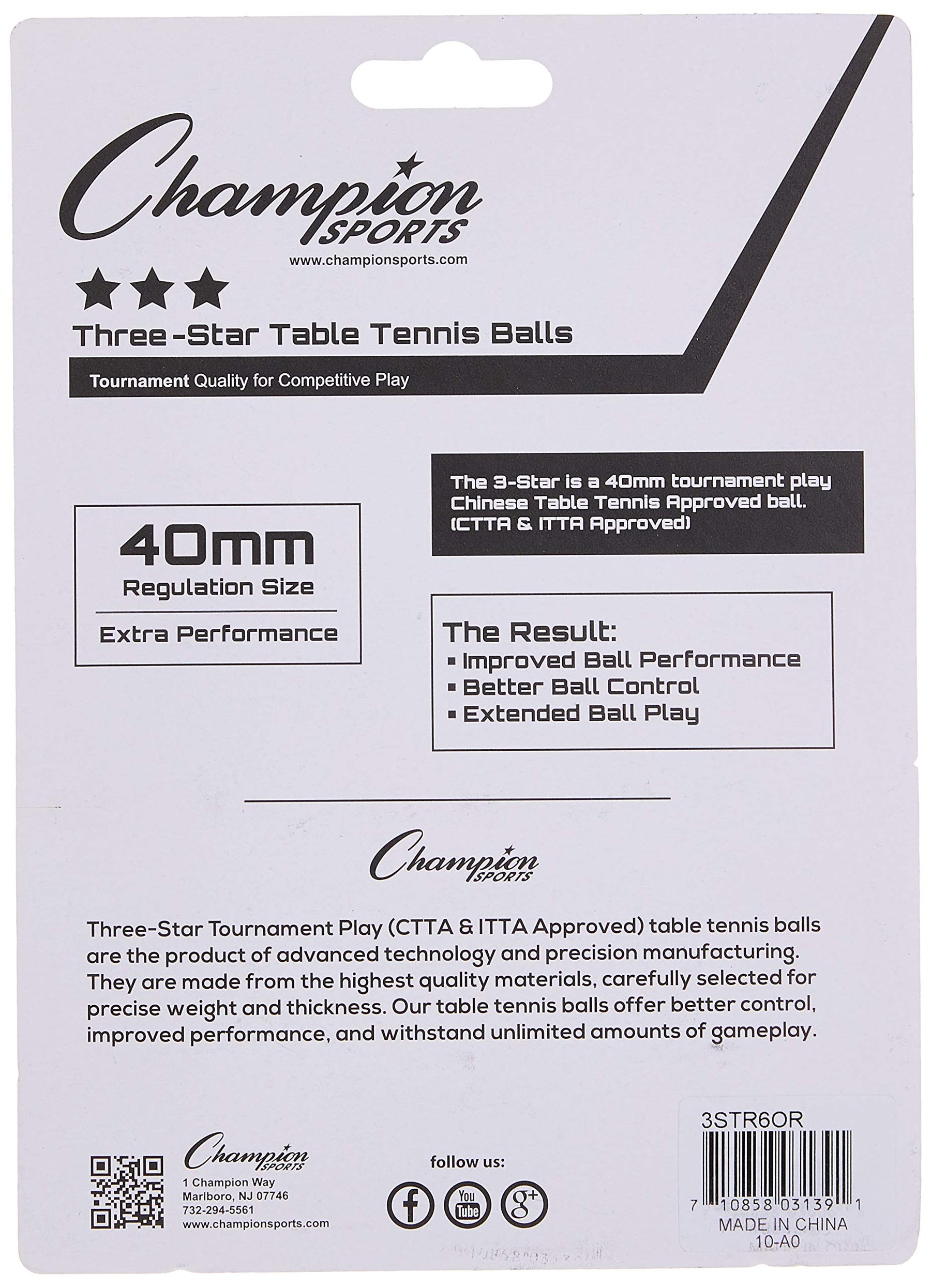 - PREMIERE PING PONG BALLS: The 3 Star Table Tennis Balls from Champion Sports are made to offer high-quality entertainment and sport for anyone. They come in sets of 6, making it convenient to play multiple games at once or for quick replacement.