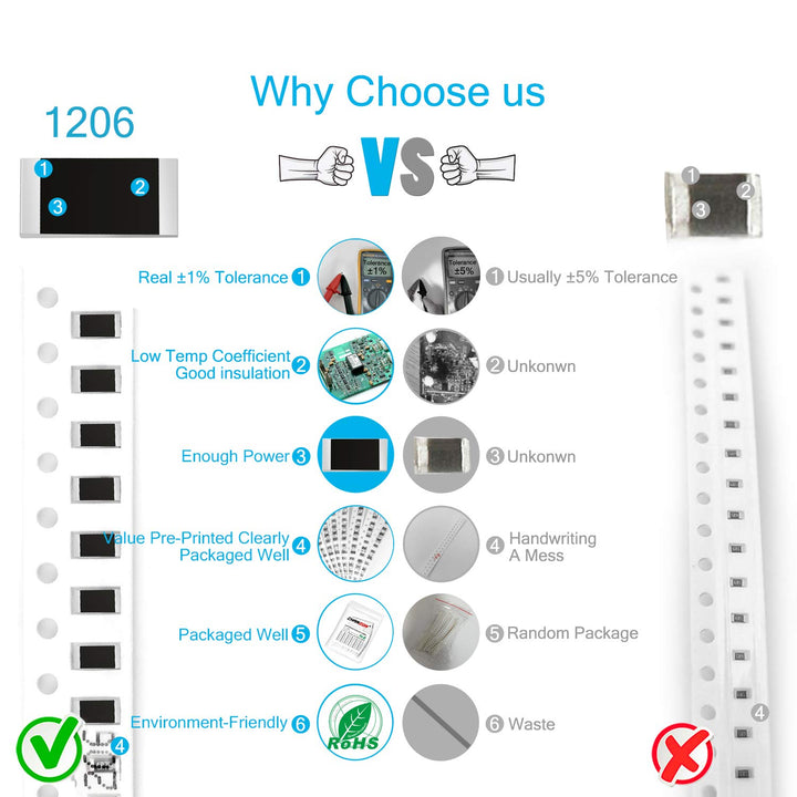 - Original Single Resistors – Chanzon 1200pcs 1206 SMD Resistor Kit 0-10M O ohm 60 Values 1/4W 0.25W ±1% Tolerance Thick Film 0-10MR SMT Chip Resistors Rohs Certificated by CHANZON
