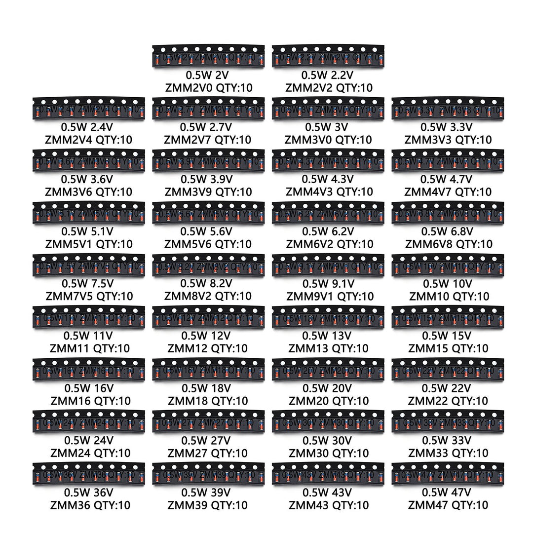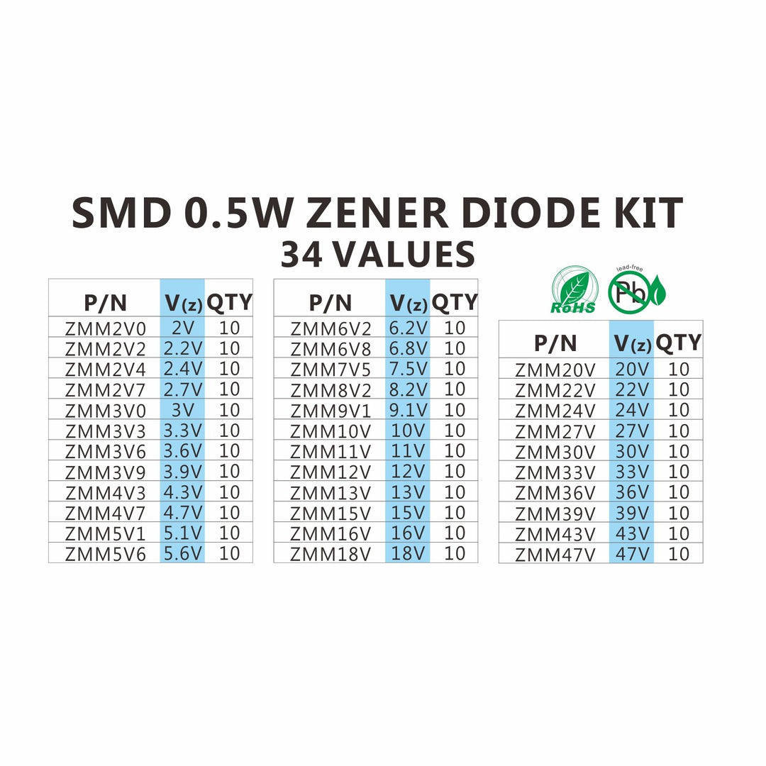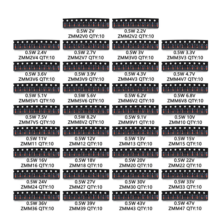 - SMD 0.5 Watt Zener Diodes Assortment Set (Pack of 34 Values, Each 10 Pieces, Total 340 Pieces)