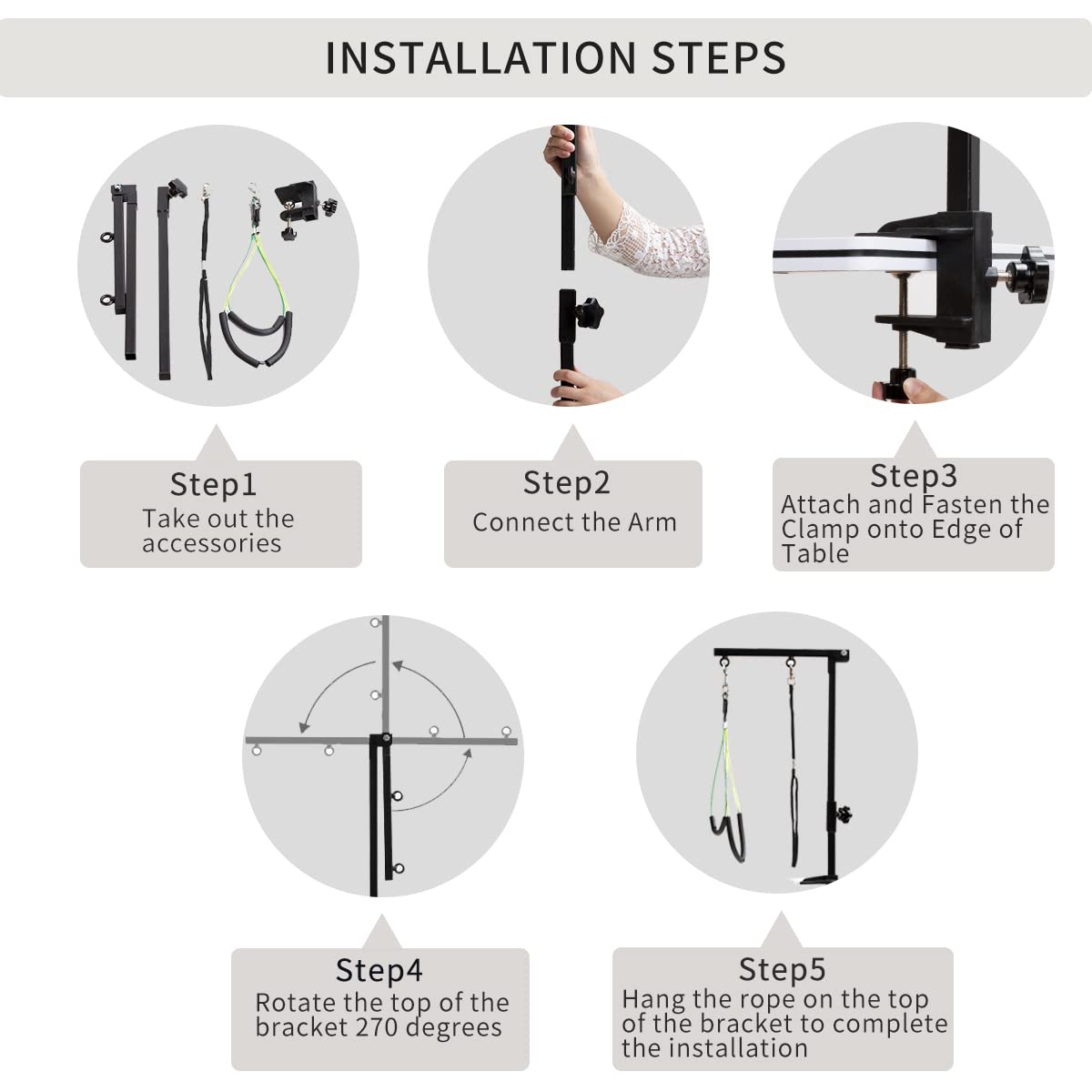 - Adjustable Height: The height of the pet grooming arm can be adjusted via the clamp. The maximum height of the pet grooming arm can reach up to 35.4 inches. This pet grooming arm is suitable for dogs weighing under 30 pounds.