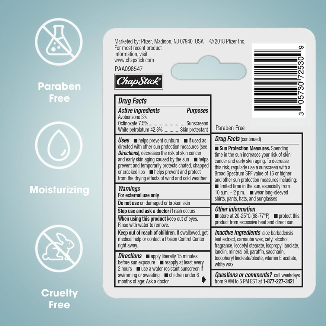 - Chapstick 12 count, moisturizer: chapstick lip moisturizer and skin protectant (12 carded pack of 3 sticks) original flavor lip balm tube, sunscreen, spf 12,0.15 ounce each (36 total sticks)