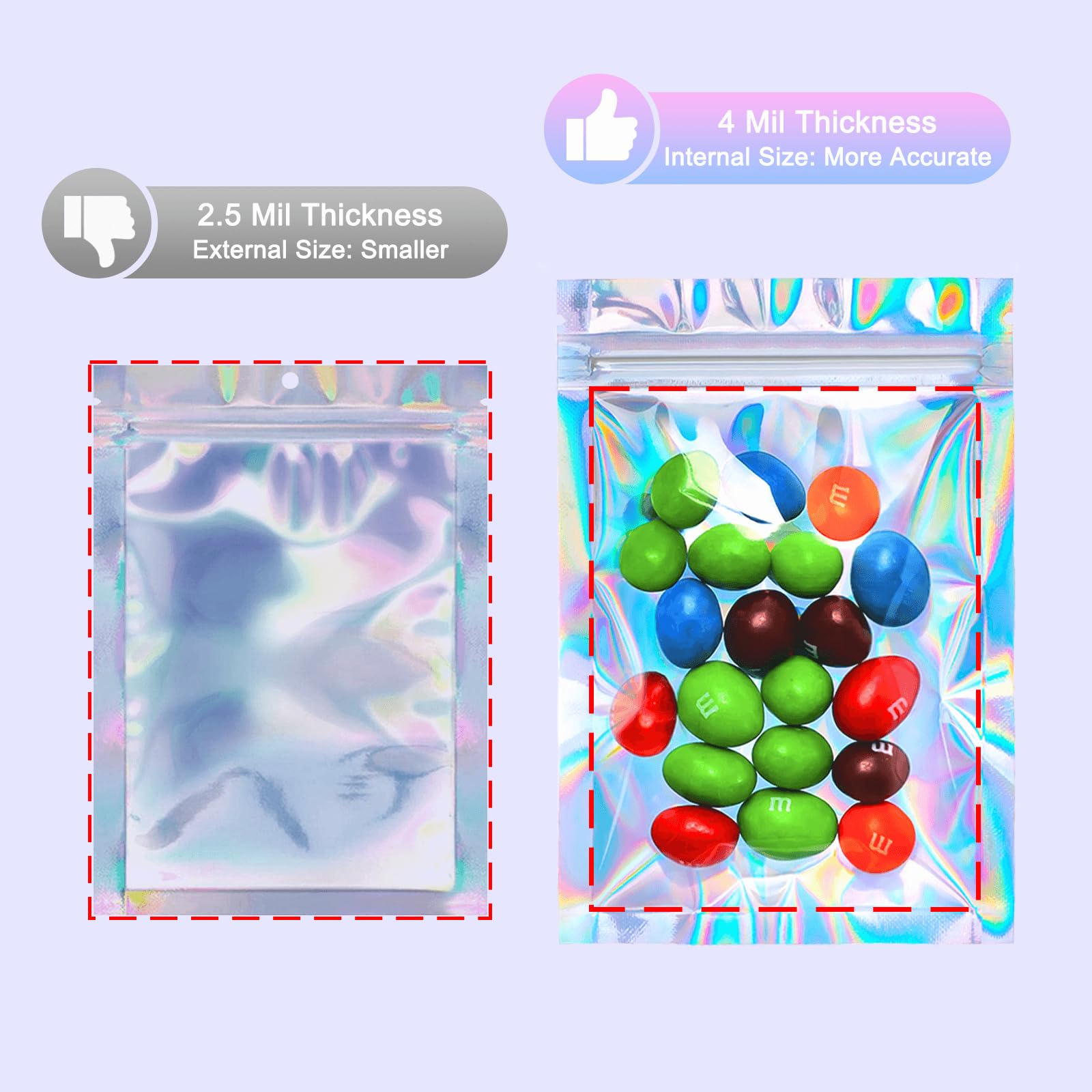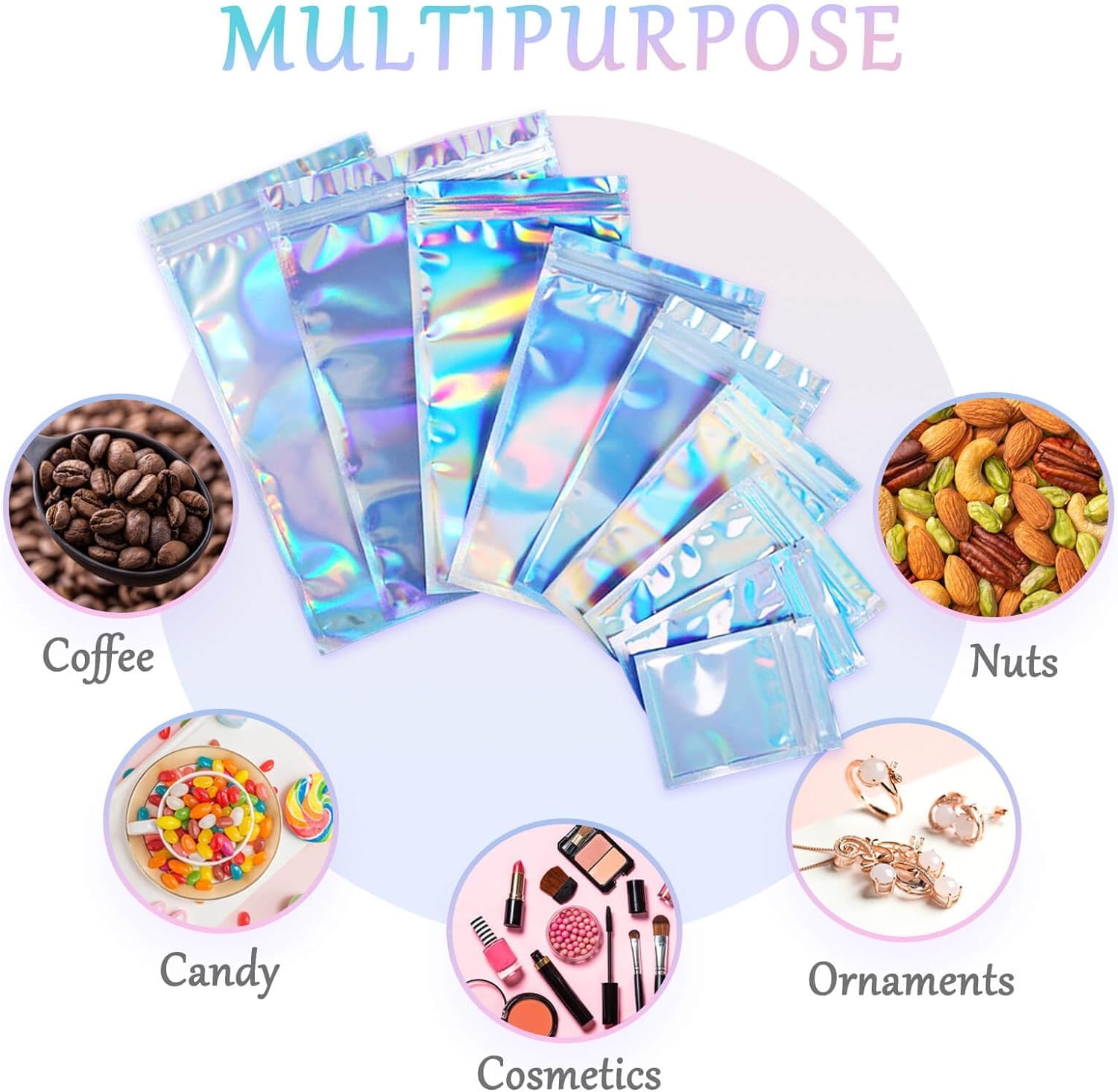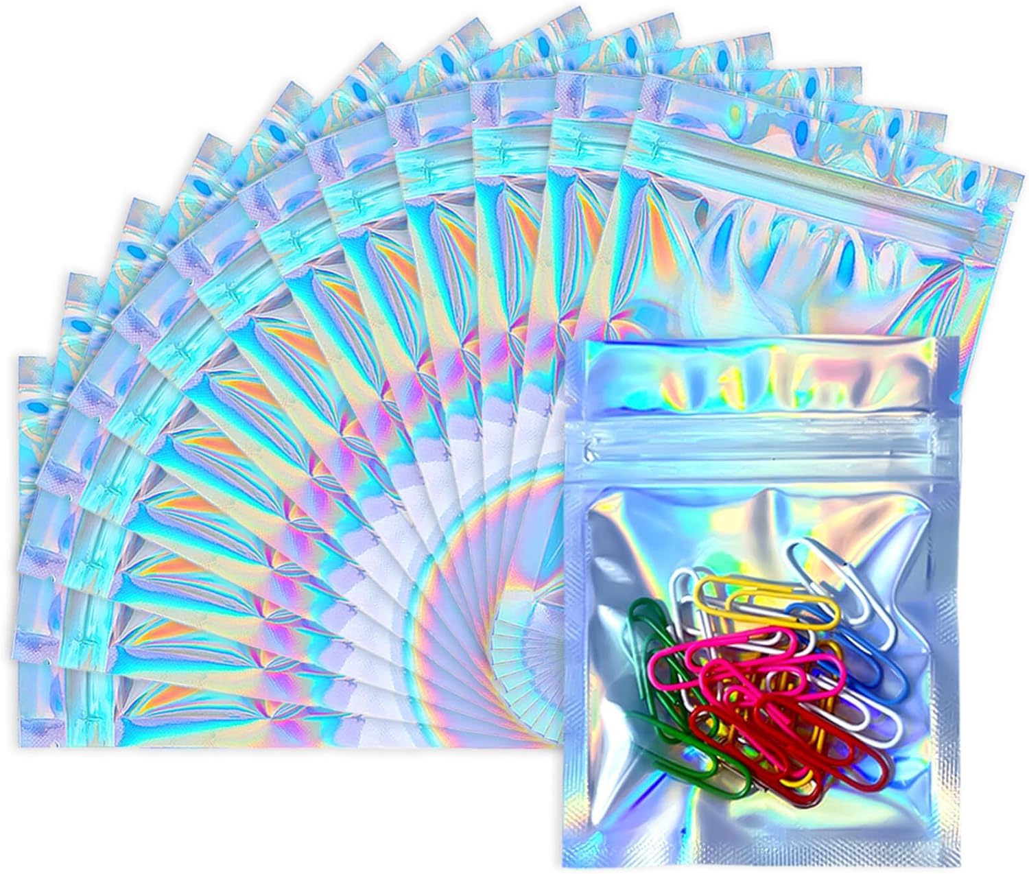 - Includes: 100 Pcs smell proof bags, thickness 4 mil. Holographic silver back with transparent front for clear viewing the items inside. When displayed indoors, you don't need to have lots of lighting to see the beautiful rainbow color.