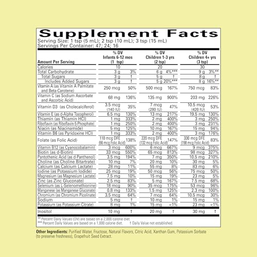 | ingredients | Vitamin A, Vitamin C, Vitamin D3, Vitamin E, Thiamin, Riboflavin, Niacin, Vitamin B6, Folate, Vitamin B12, Biotin, Pantothenic Acid, Choline, Calcium, Iodine, Magnesium, Zinc, Selenium, Manganese, Chromium, Potassium, Inositol, Purified Water, Fructose, Natural Flavors, Citric Acid, Xanthan Gum, Potassium Sorbate, Grapefruit Seed Extract |