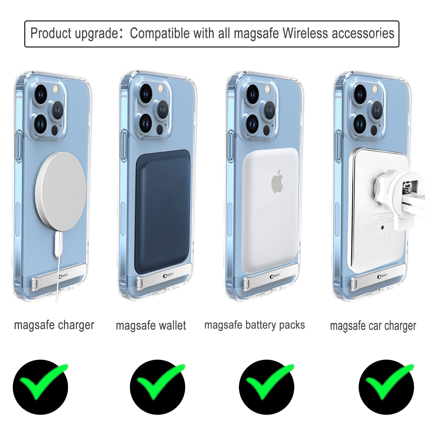 - Small but strong metal kickstand---- We have widened and improved the hinge portion of the stand, greatly improving thrust and durability. It can easily lift a heavy enough iphone 13 pro max and adjust it to any angle without worrying about falling. The main body width of the stand is still maintained at 0.315 inches, which is compatible with all magsafe wireless accessories.