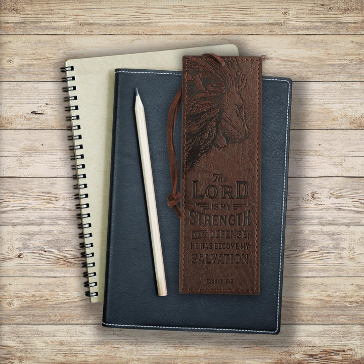 - Scripture Bookmark: This Bible verse bookmark features the scripture sentiment from Exodus 15:2 in debossed design with a regal lion silhouette in handsome rich brown with leather cord tassel.