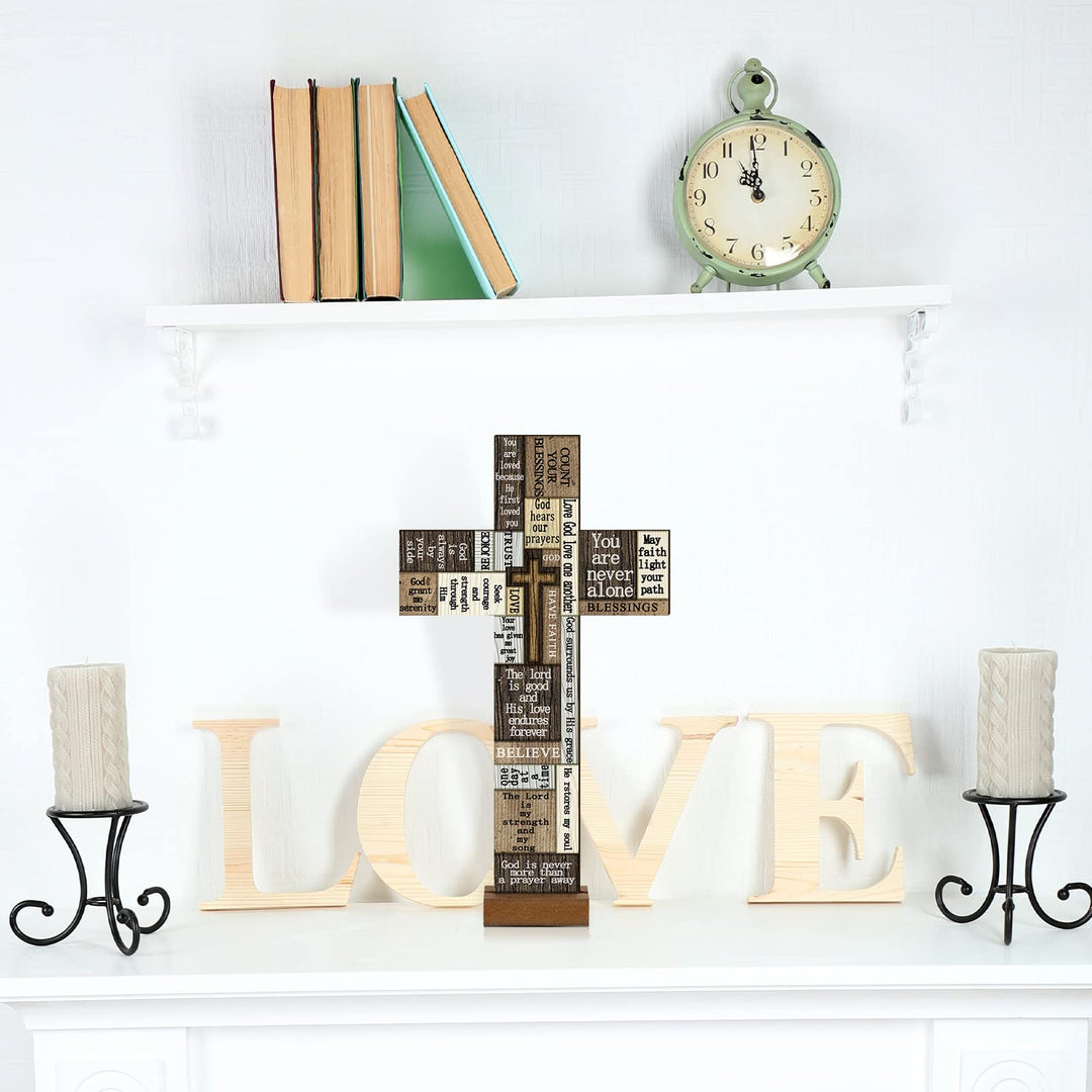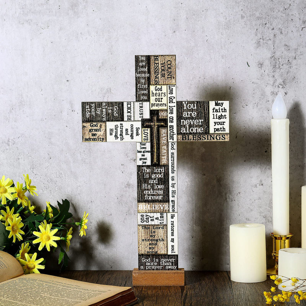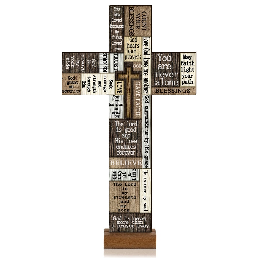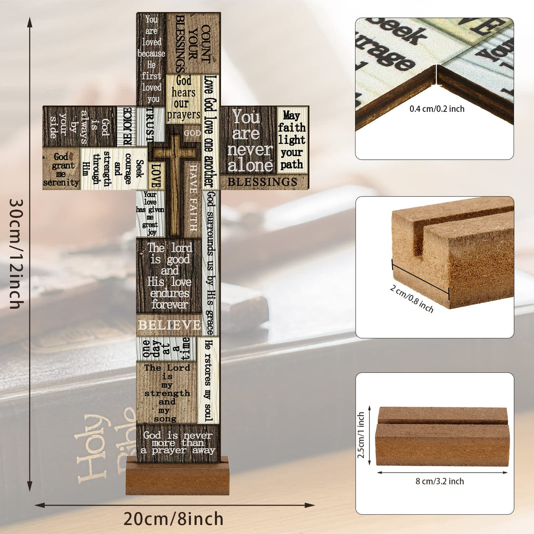 - Creative and holy design: christian products plaque features cross shape appearance with multiple scripture sayings; This wooden table decoration is a good addition to your home such as wall, living room, for prayer room, front yard and more with heavy religious atmosphere of the Jesus Day