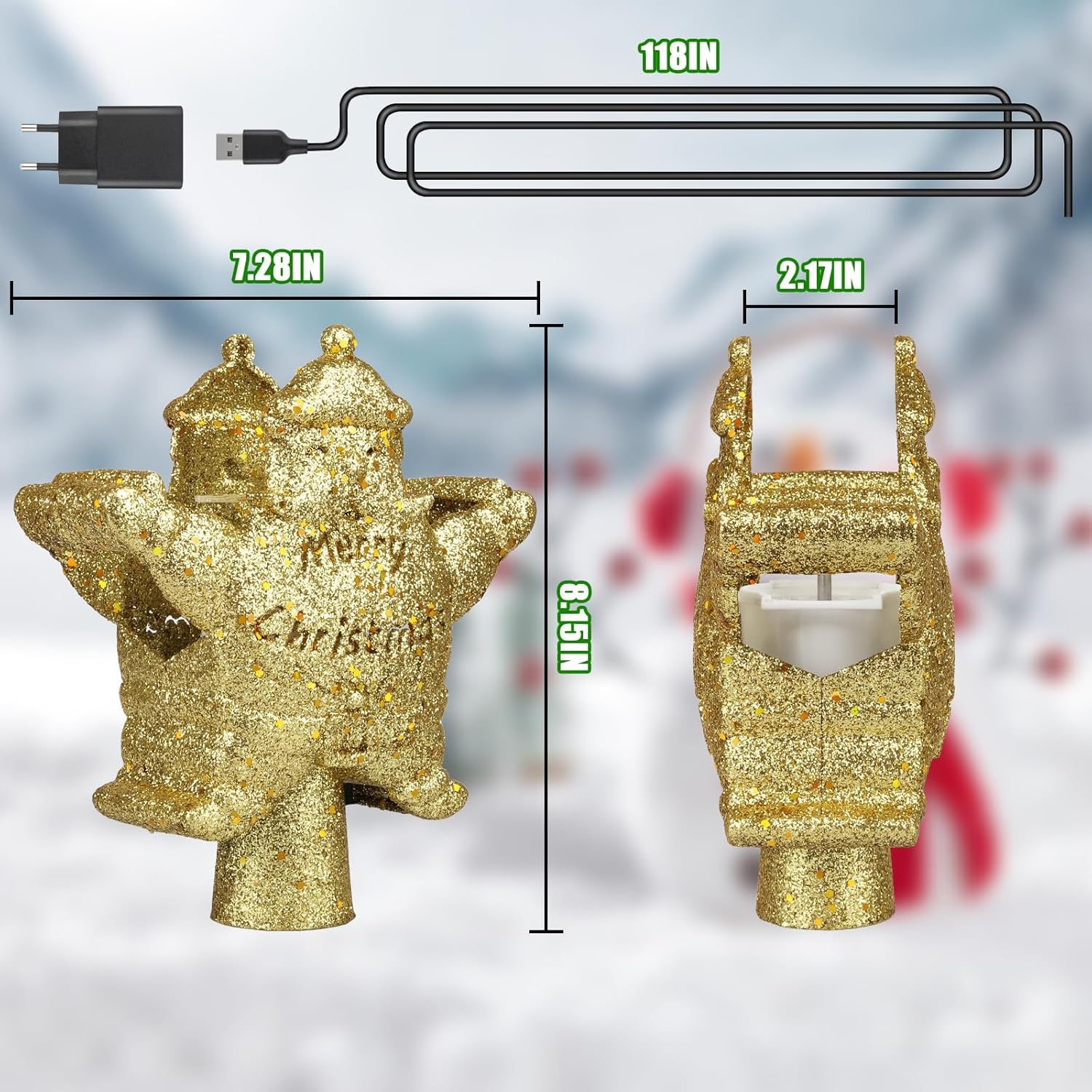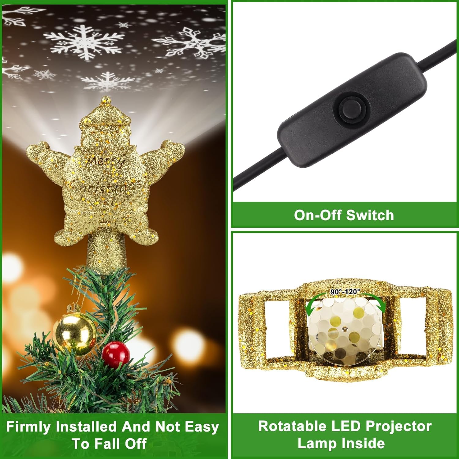 - HIGH QUALITY AND DURABLE: The gold Santa Claus tree topper decoration is suitable for all Christmas trees of different sizes. 118inch of plug wire is also enough to make the top of the tree easy to connect without worrying that it doesn't fit your tree. Each light comes with a stable hexagon base to protect your Christmas tree topper from falling down or tipping. At the same time, it can also serve as an ideal LED night-light projector for children to decorate their rooms.