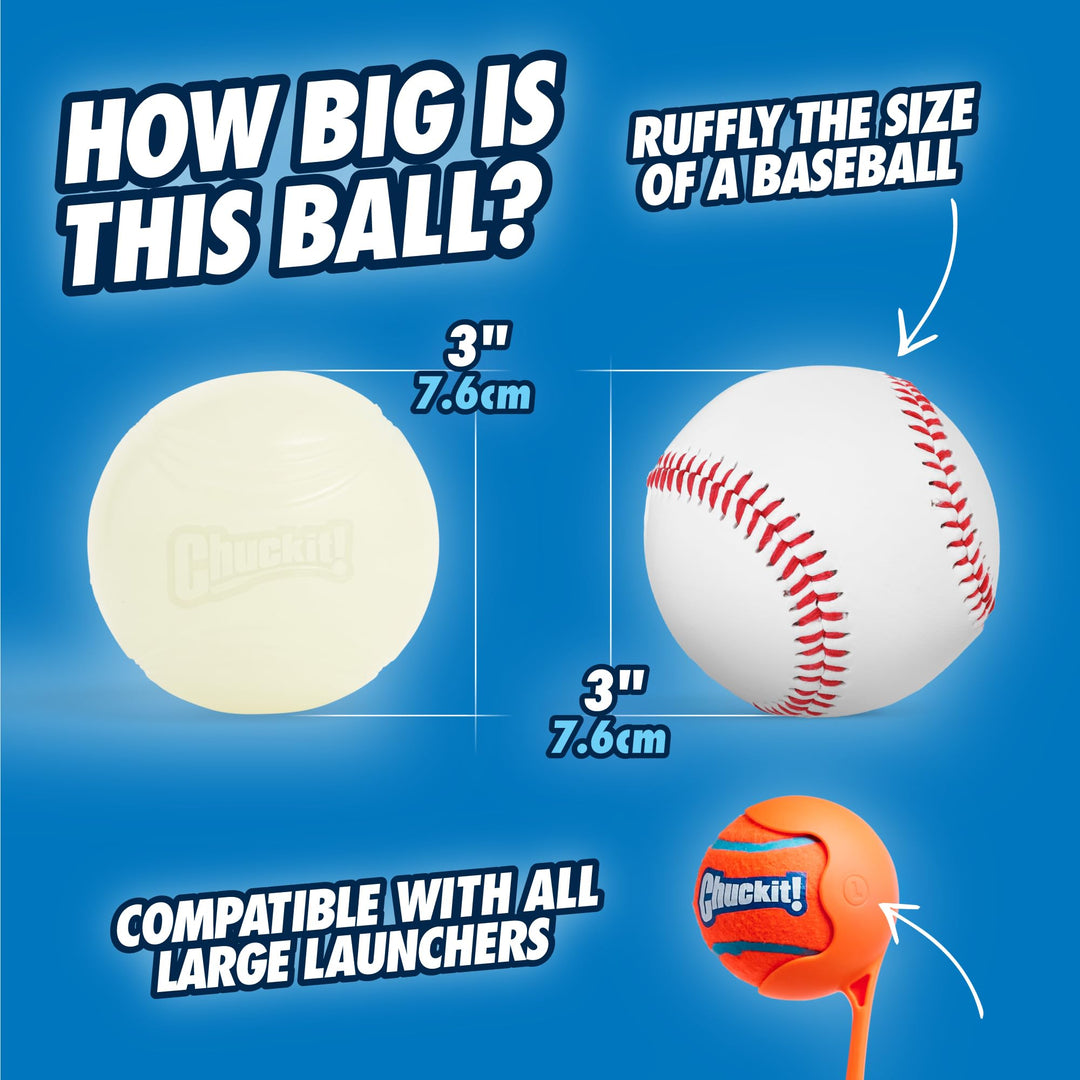 - IDEAL FOR NIGHTTIME FETCH: Compatible with large Chuckit! Launchers, these 3-inch glow in the dark balls make fetch exciting for dogs weighing 60-100 lbs