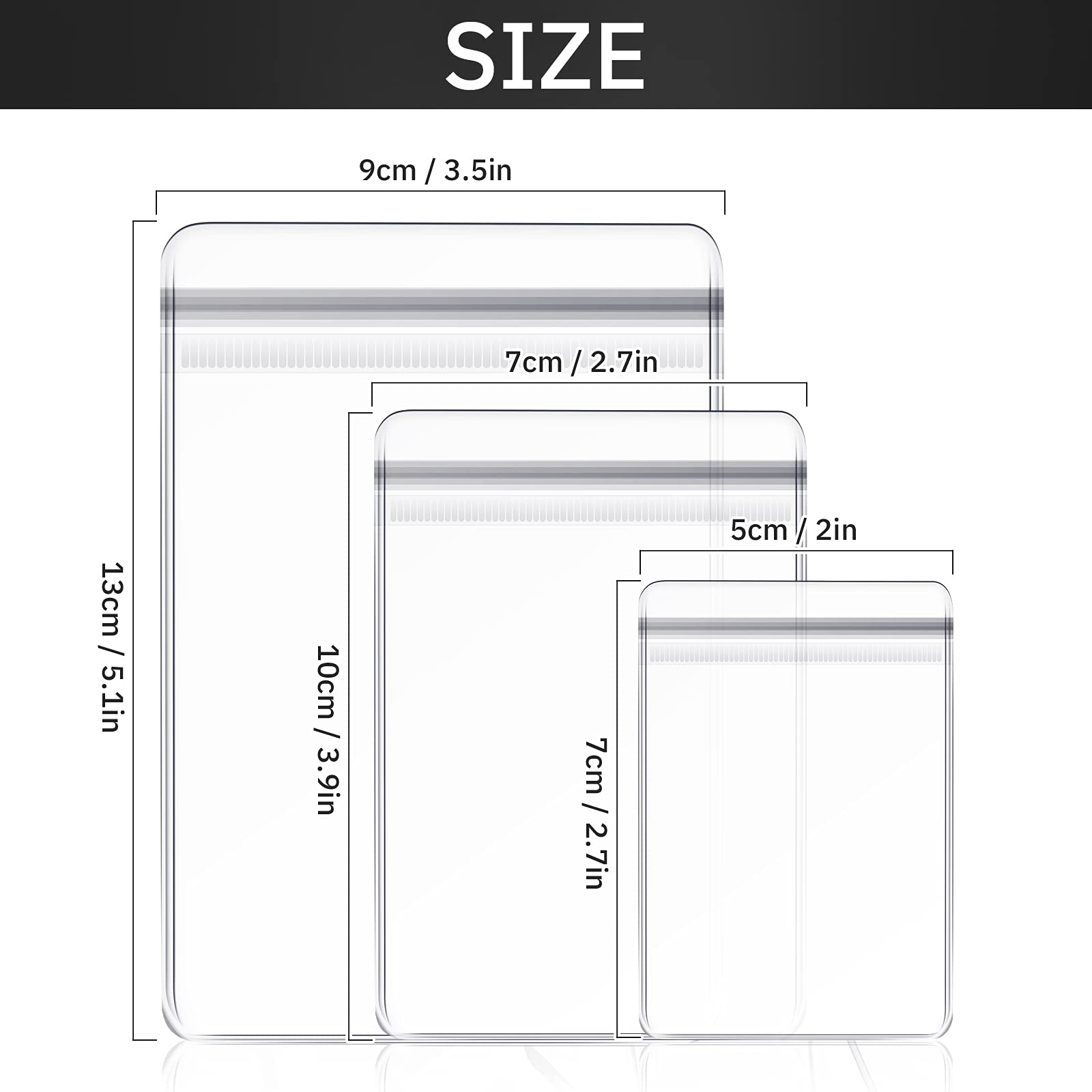 - What you get: the package includes 120 pieces zipper reclosable bags in 3 different sizes, including 5 x 7 cm/ 2 x 2.8 inch (60 pieces), 7 x 10 cm/ 2.8 x 4 inch (40 pieces) and 9 x 13 cm/ 3.5 x 5 inch (20 pieces), which are easy to store and carry, and won't take up too much space, so they are a good choice for storing small objects