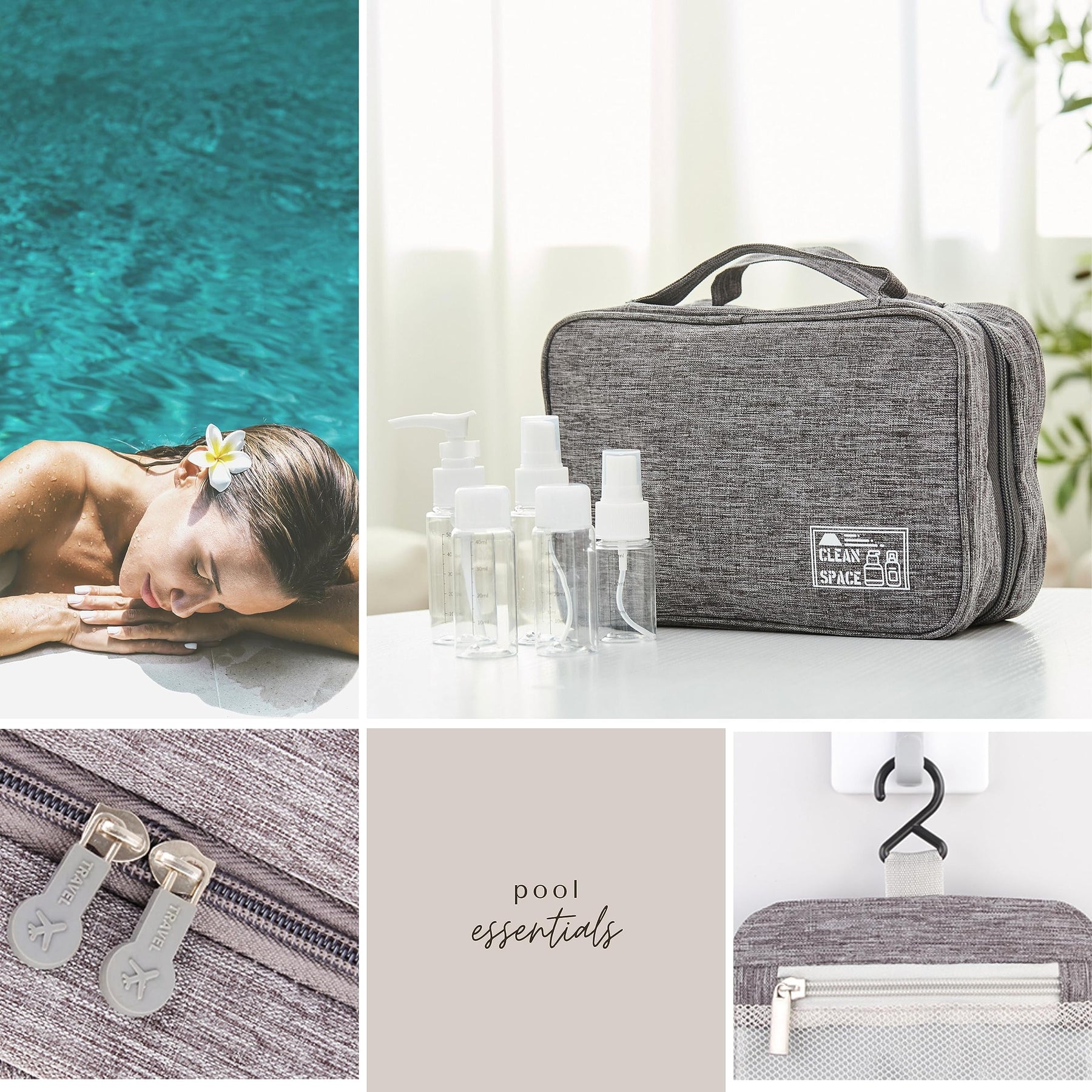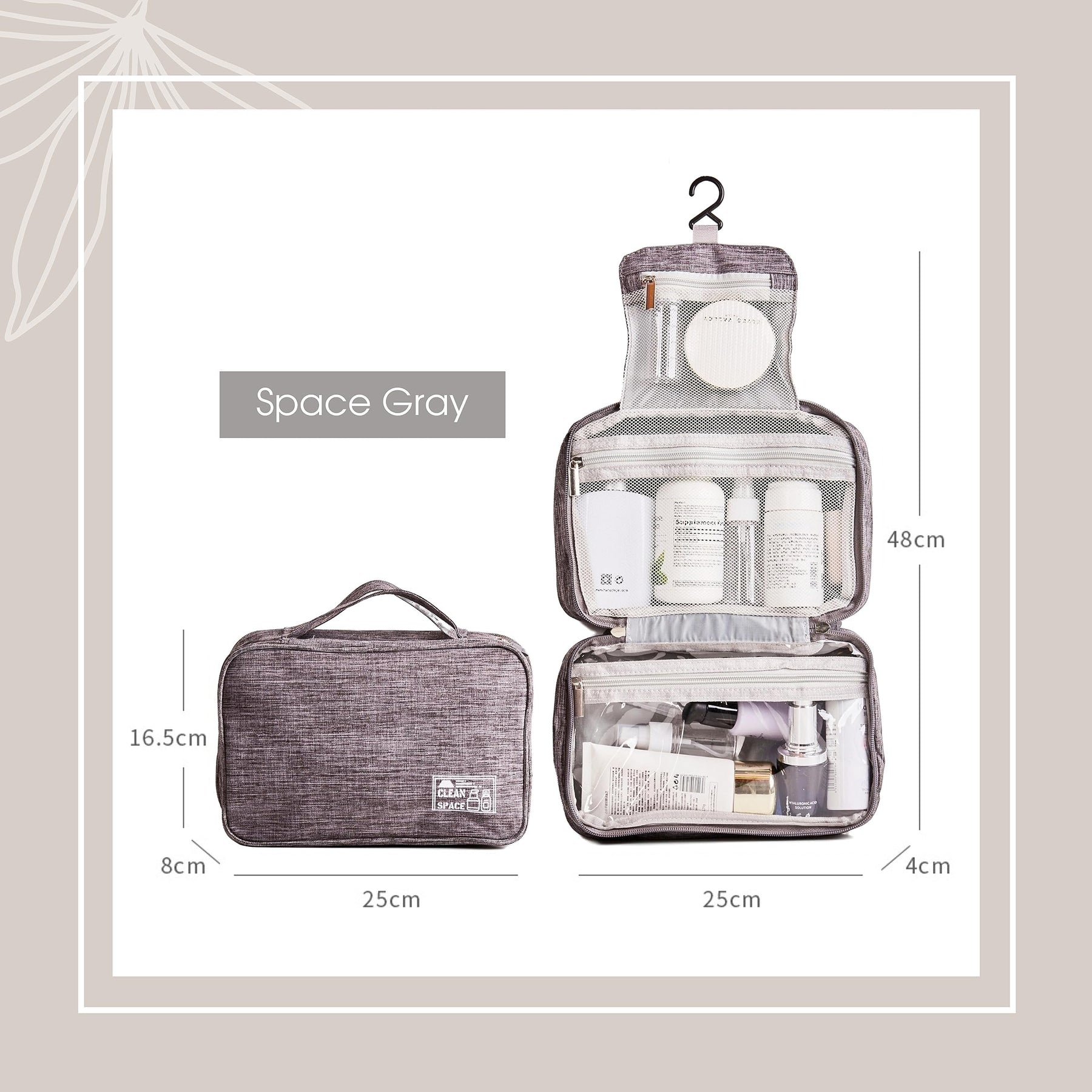 - Colors — The CLEAN SPACE toiletry bag is currently available in two different colors: Space Gray and Elegant Black. This allows you to choose the color that best matches your personal style.
