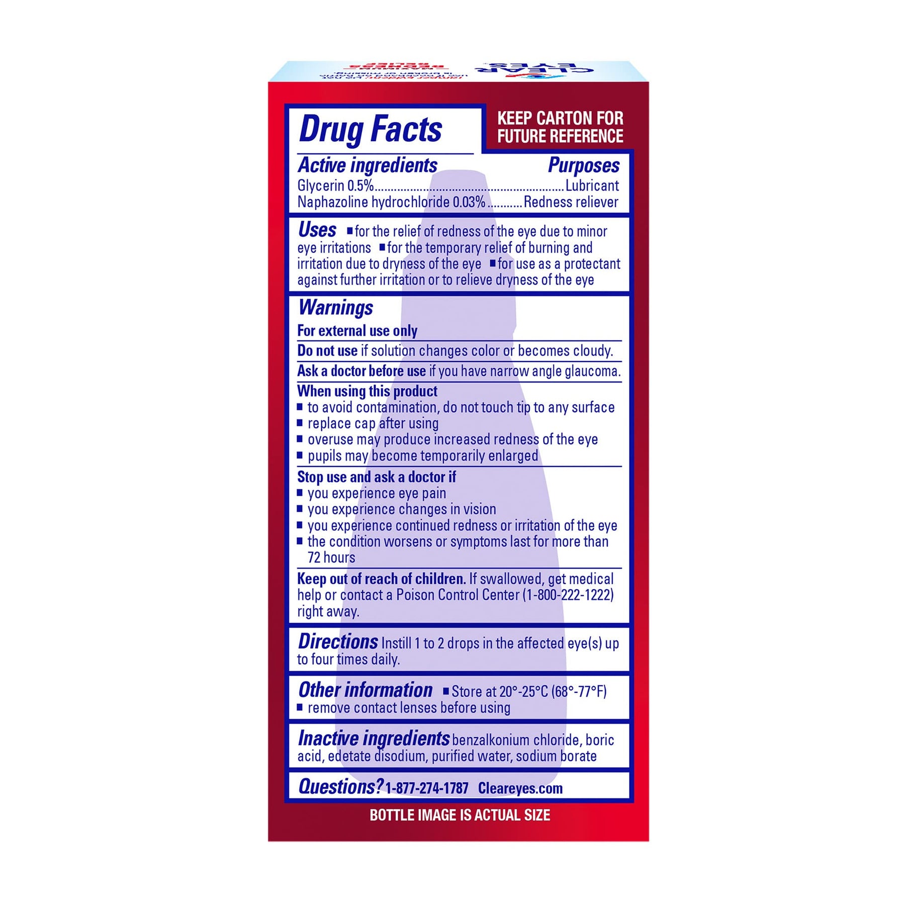 ingredients | Active Ingredients: Glycerin (0.5%) (lubricant), Naphazoline Hydrochloride (0.3%) (redness reliever); Inactive Ingredients: Benzalkonium Chloride Solution, Boric Acid, Edetate Disodium, Water (Purified), Sodium Borate |