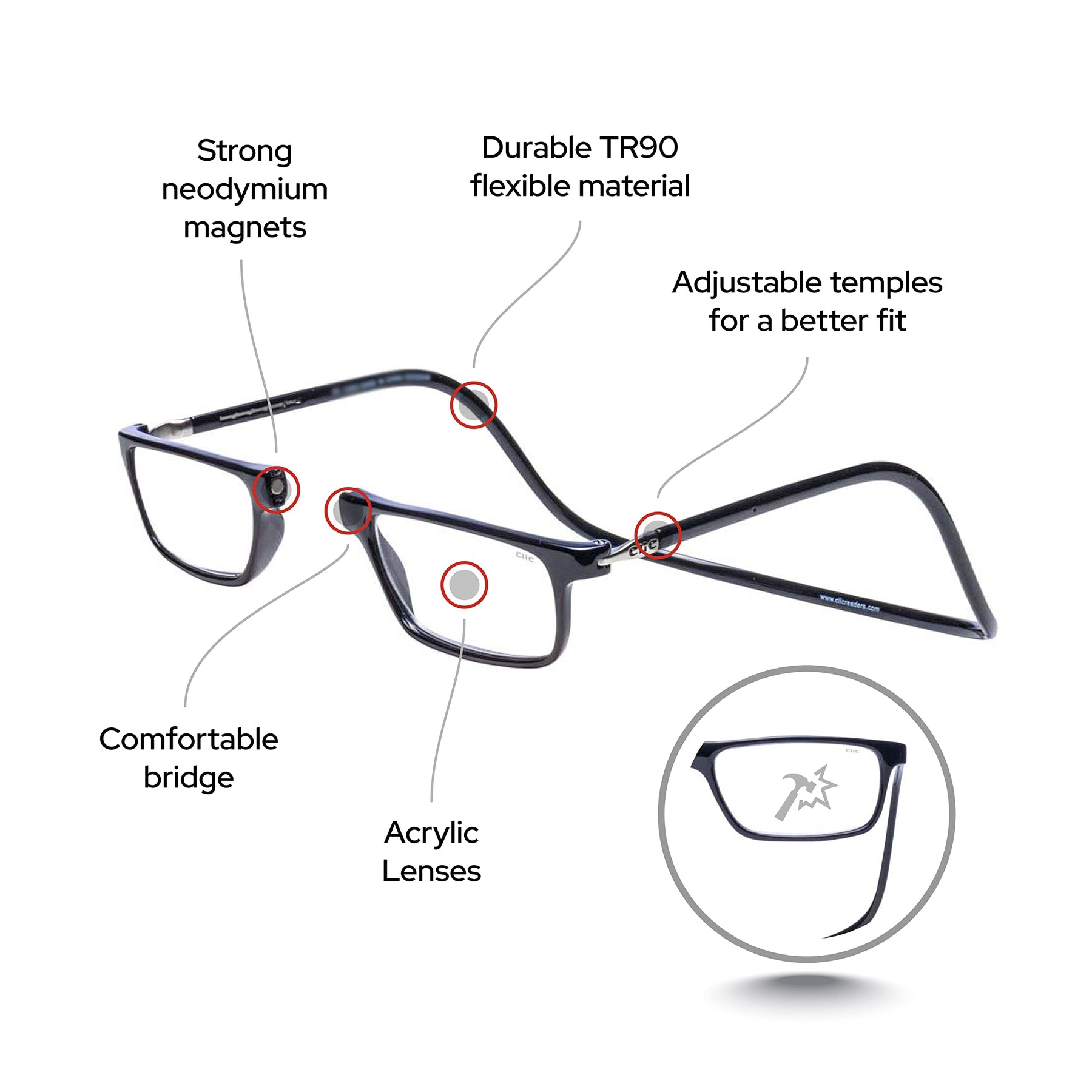 - QUALITY YOU CAN RELY ON. Your CliC readers are manufactured with high-impact acrylic lenses, strong neodymium magnets, and a durable TR90 wrap-around rigid headband strap. Along with our unique 180 degree hinges that allow each lens to fold upward towards the frame or straight down around the neck. CliC glasses are built with the expectation that you'll be wearing them for years to come.