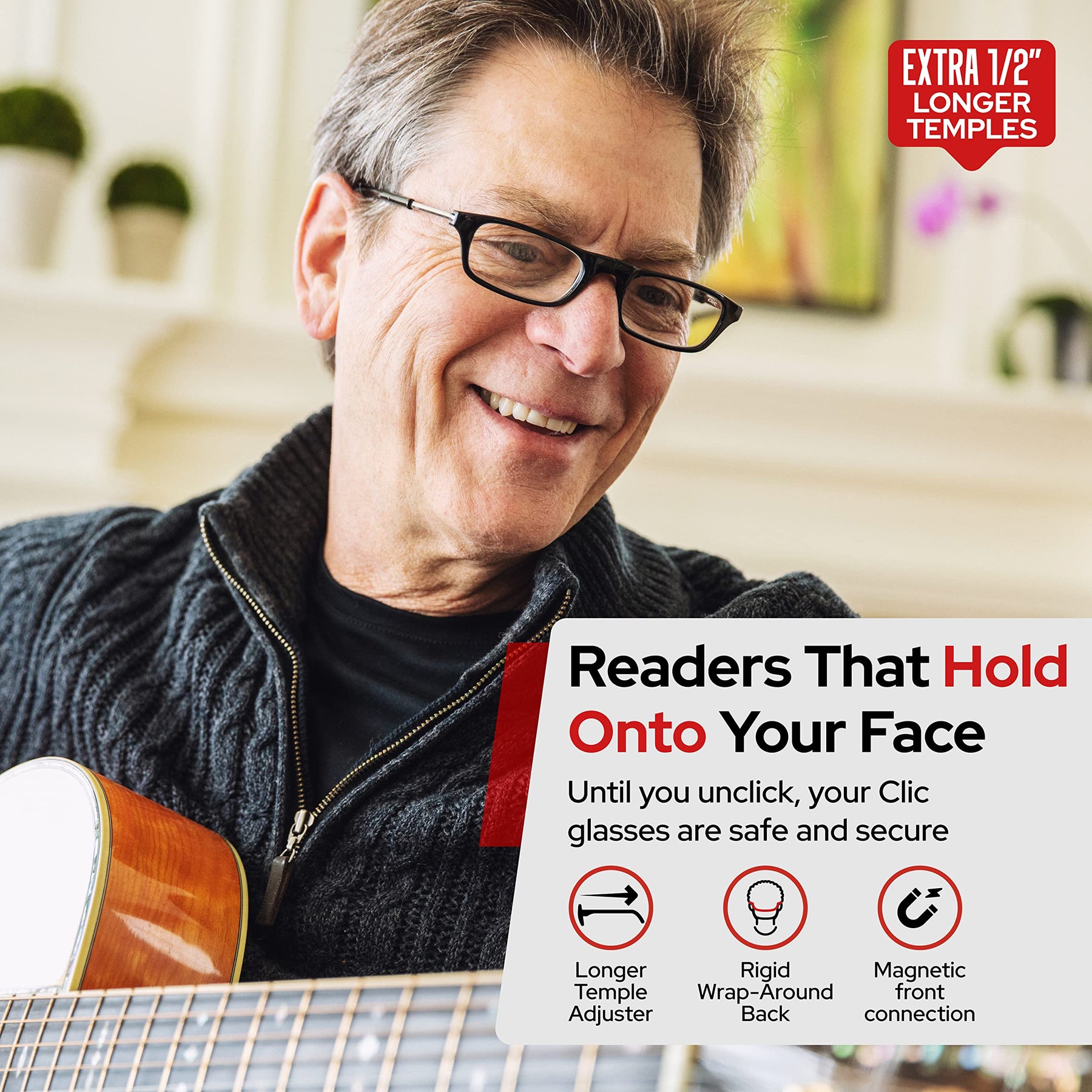 - STOP LOSING YOUR READERS. The easiest way to lose your readers is setting them down, but with CliC they’ll always be around. The durable frame and wrap around band are made to live life with you. With one click of the front magnetic connection, you’ll seal your readers around your neck, ready for what’s next.