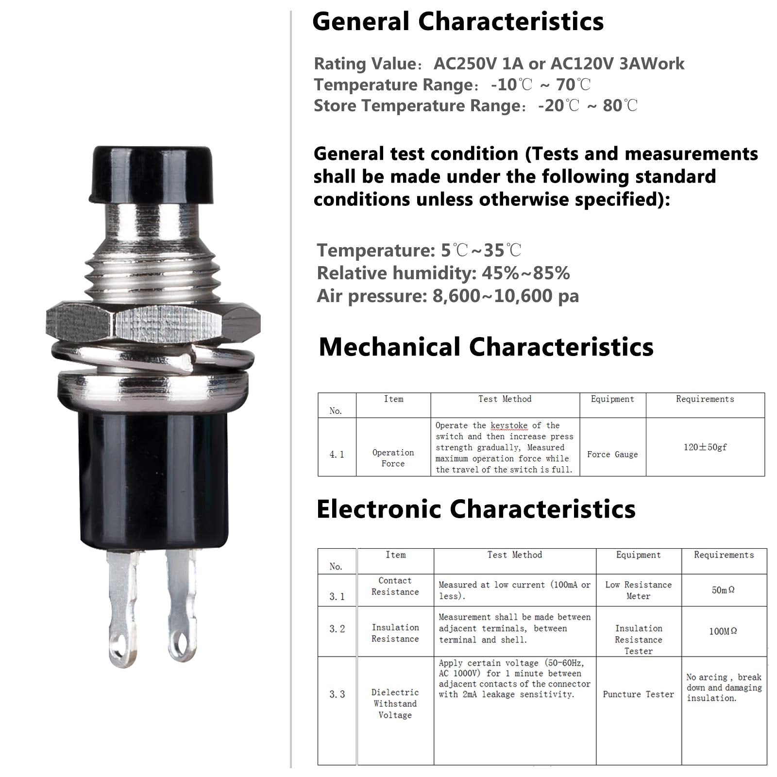 - Product Name: Push Button Switch; Action Type: Momentary; Contact Type: Normal Closed(NC); Poles: SPST.