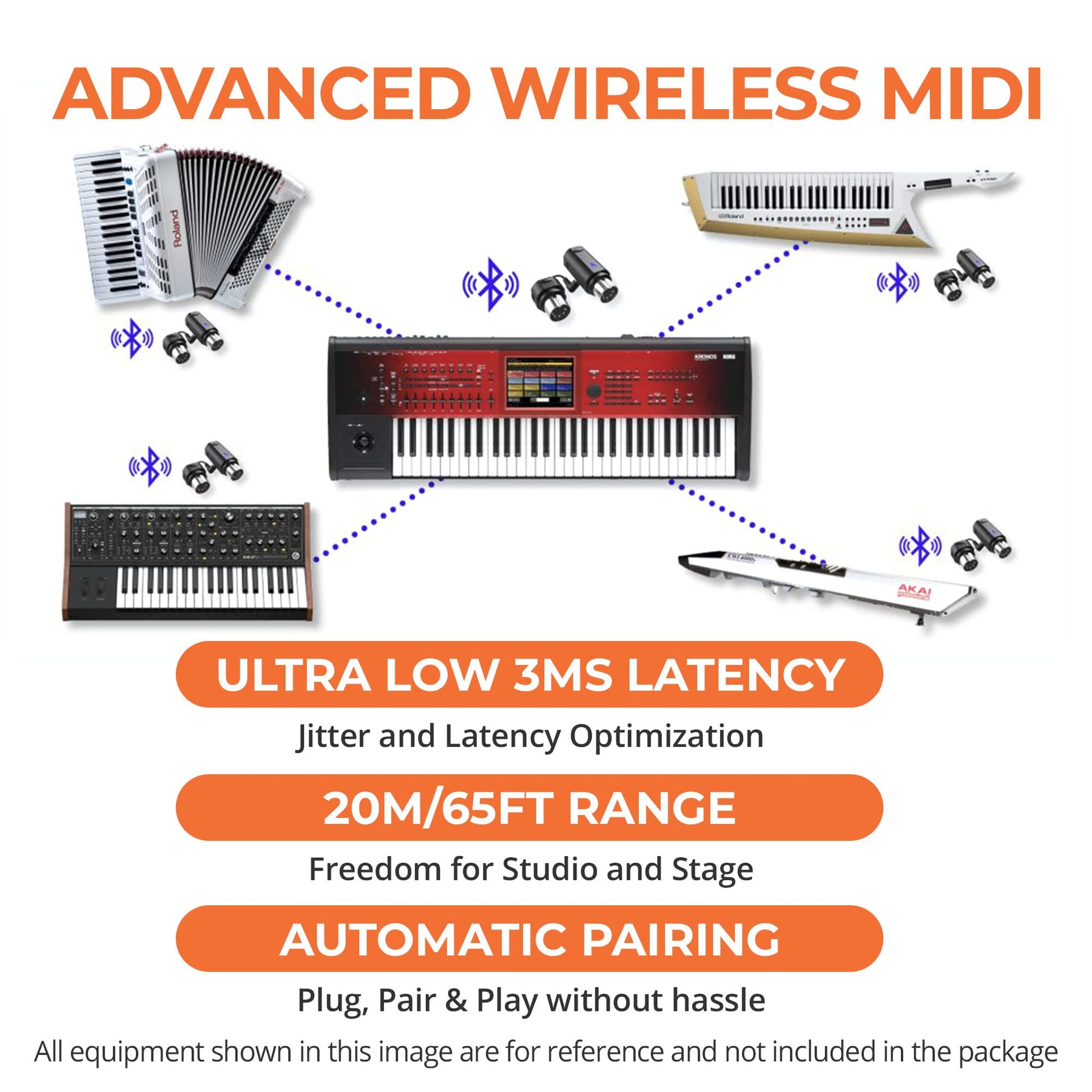 - [Get rid of those cables] Add Bluetooth MIDI to your MIDI devices and reduce the cable clutter in the studio. Enjoy freedom on stage. Powered via MIDI Out. No batteries needed. Check out bluetoothmidi(dot)com to find out if your device is compatible.