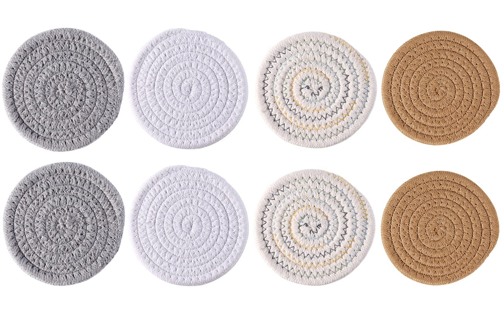 - 8-Piece Set: Handcraft braided coasters, colors as image shows.