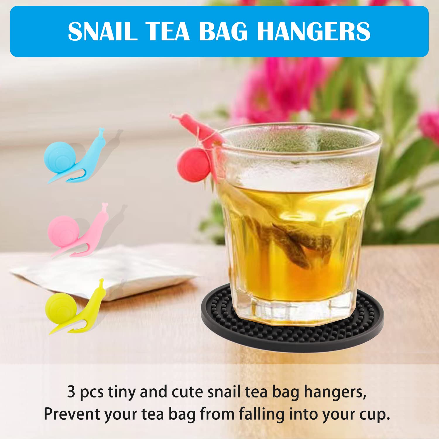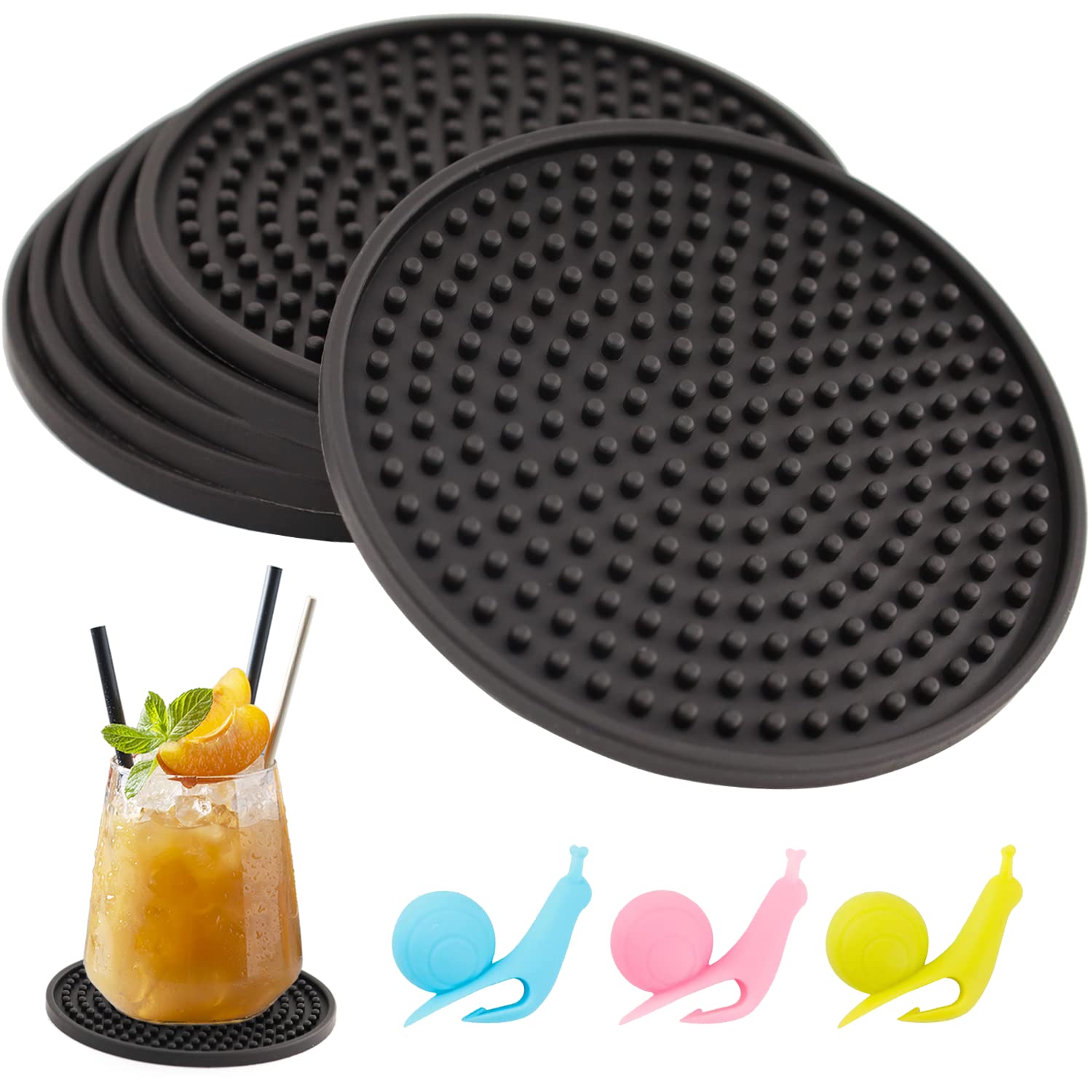 - PACKAGE QUANTITY:There are a total of 6 pcs 3.94 inch oversized black coasters for all types of cups and comes with 3 pcs snail tea bag hangers.