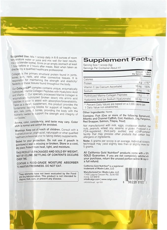 - Original – Collagen Peptides Powder with Hyaluronic Acid, Support for Healthy Hair, Skin, Nails, Joints and Bones, Non-GMO, Gluten and Dairy Free, Unflavored, 7.26 oz, Fish Sourced by California Gold Nutrition Store