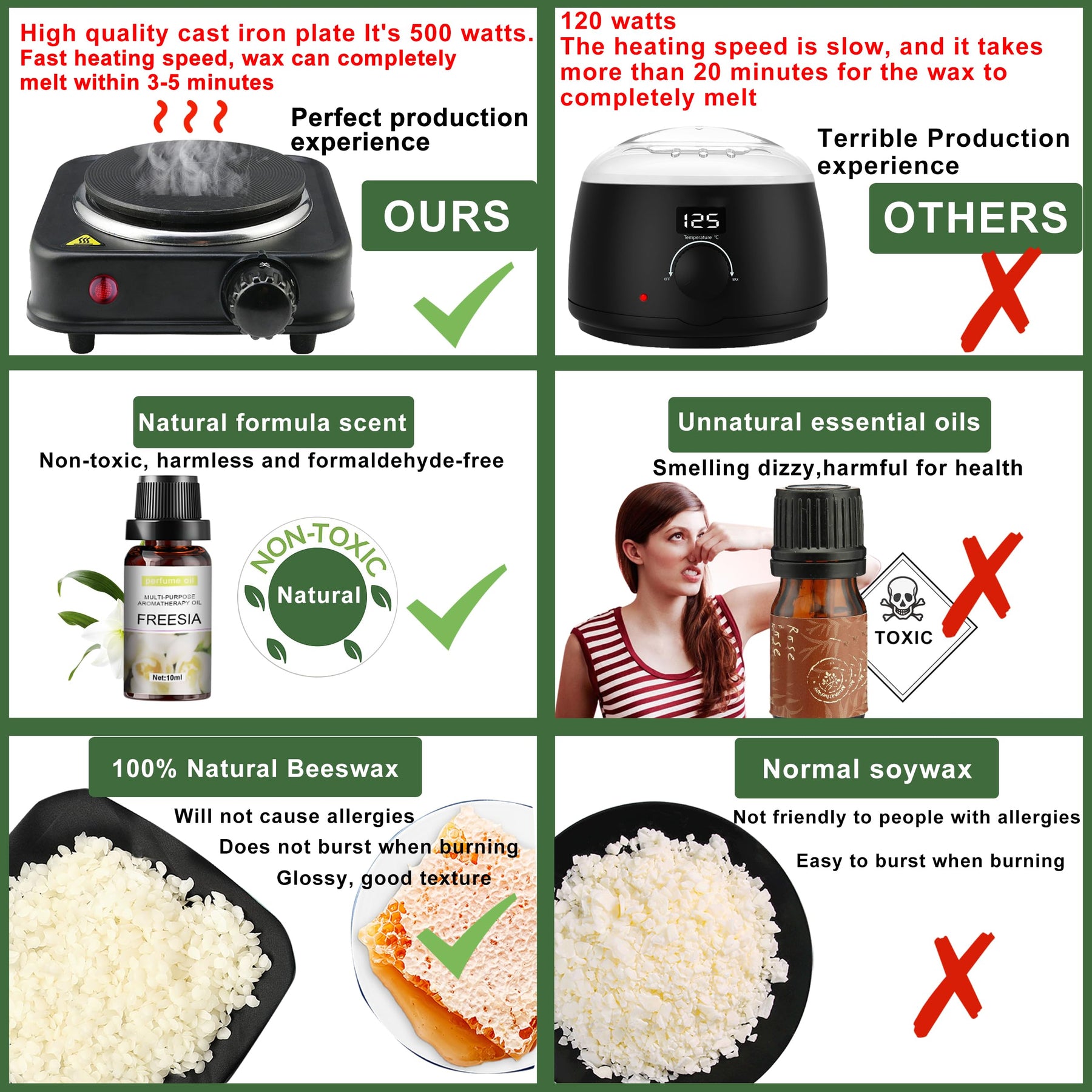 - Advanced Wax Material: Our candle making kit is made of 100% natural wax, the candle will not be easily deformed, cracked or melted, it can burn cleanly for a long time and effectively release the smell. No need to worry about the unhealthy chemicals found in traditional paraffin wax, we only use plant-based additives that naturally exist in the environment.