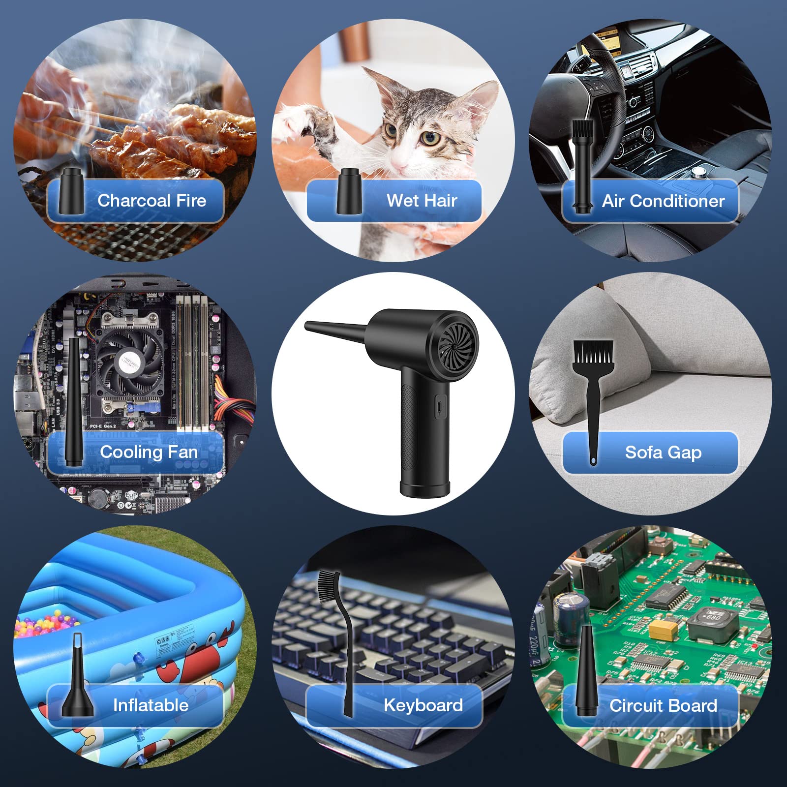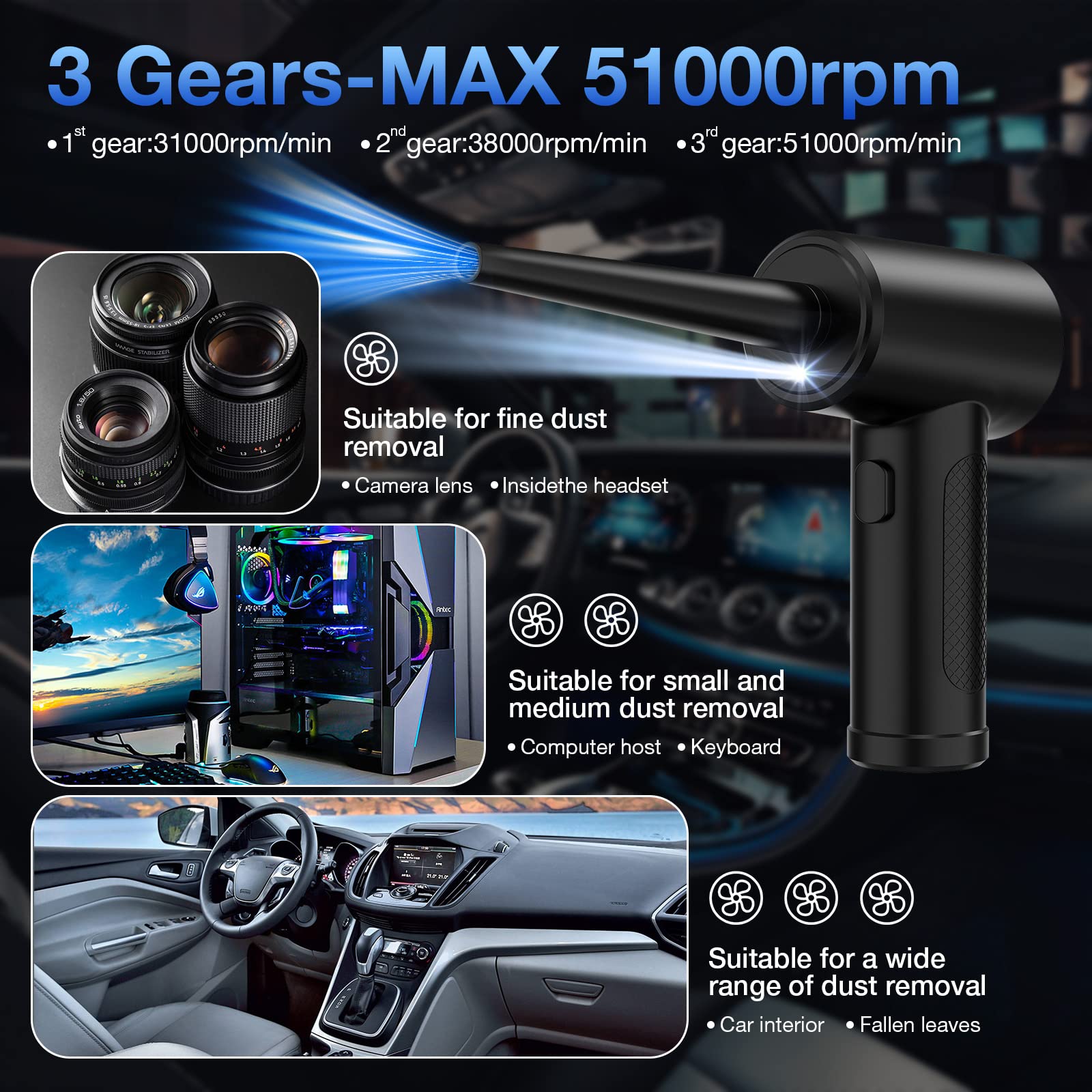 - 3-Speed Adjustable Power: Compressed air dusters are equipped with 3 gears of air speed, 31000-51000RPM speed selection, generating incredible airflow, Perfect replacement for compressed air cans. Great one for family, friends, workman, mechanic.