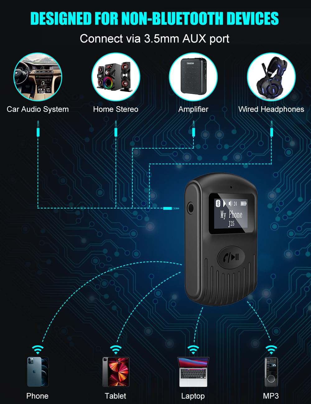 - 1.1 Inch LCD ScreenThis Bluetooth AUX adapter has a clear LCD which makes your operation easier. Only a simple glance at the screen, you can get all the information about the wireless streaming status, such as Bluetooth connection status, battery, volume and connected devices names, etc.