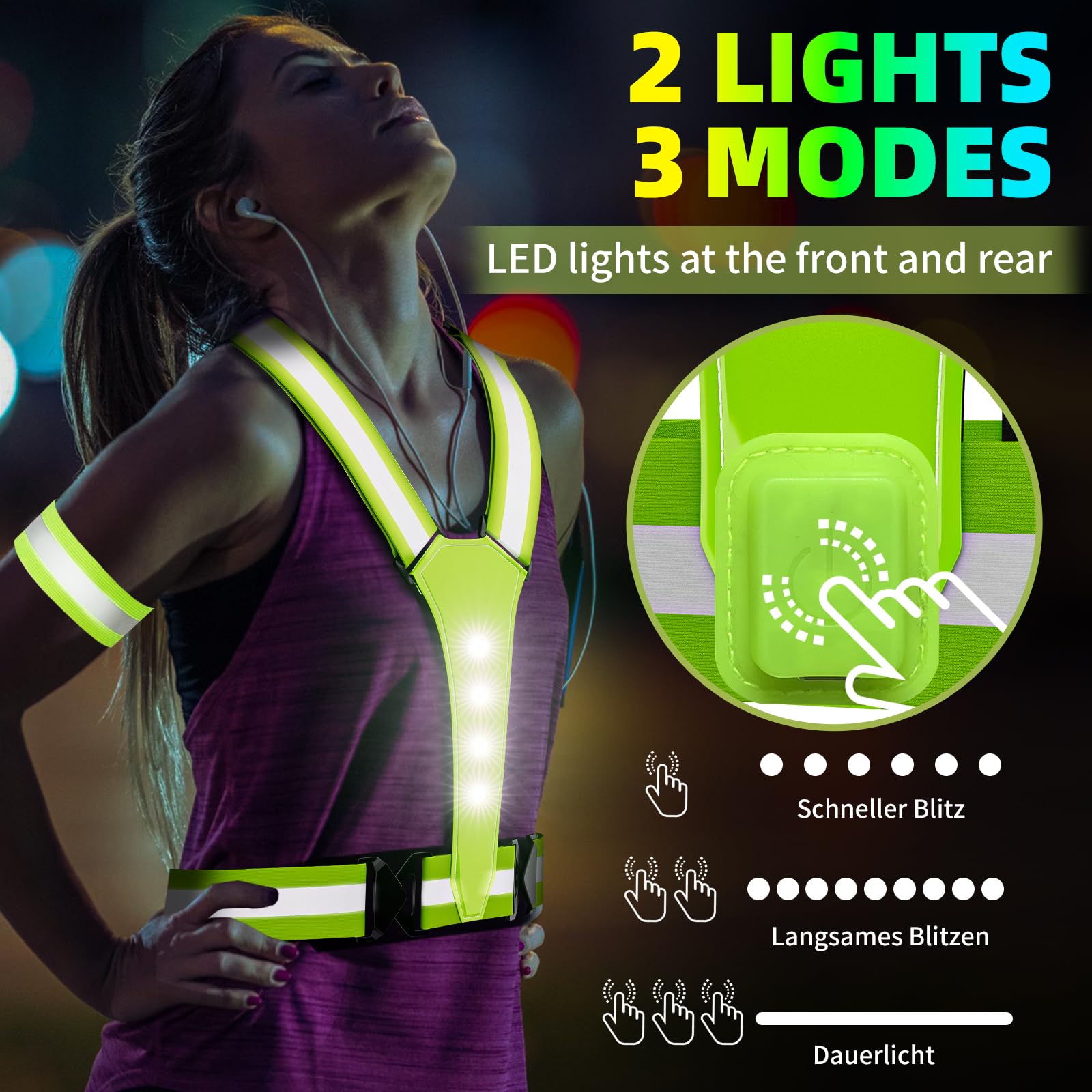 - 360°Reflective VestLED vest underwear provides 360 ° visibility.High brightness LED luminous vest makes it more eye-catching in low light areas, while reflecting the ushered light, can exceed 1000 feet of ultra-long distance LED light reflection. And it has 3 light patterns, 40% more than the previous generation of reflective material.