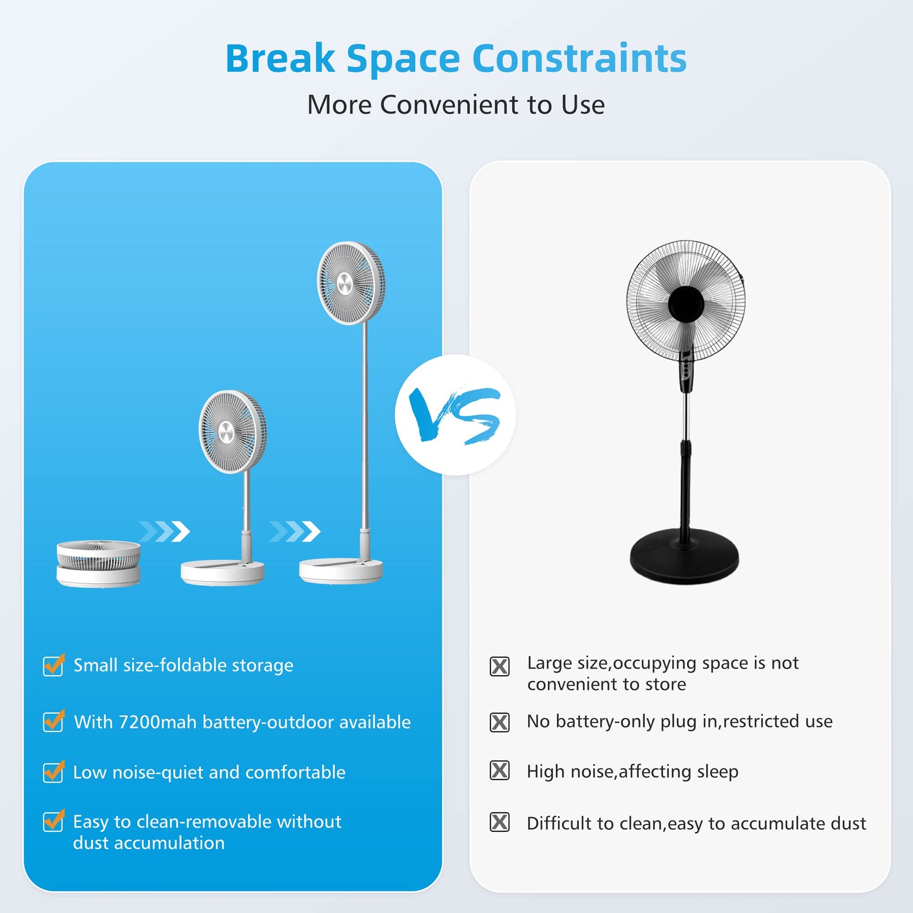 - [Portable fans for travel & space saver] The portable fan can be folded to a small size (Folded Height 4.5 X9.84 inches), you can pack it in your backpack to wherever you go. Meanwhile, you can easily store it in your locker when you don't need it, saving space in your home.