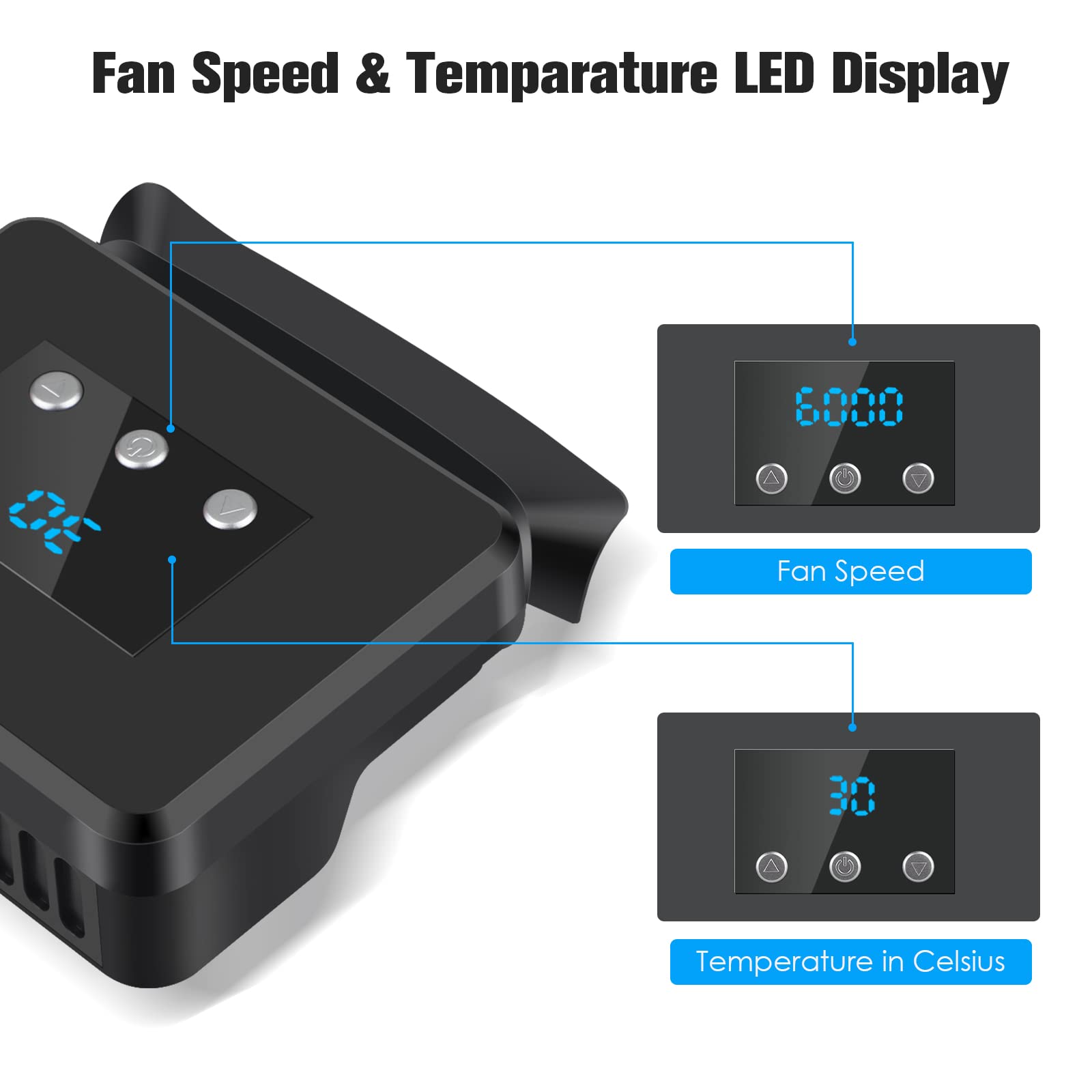 - LED DISPLAY WITH FAN SPEED & TEMPERATUREThe digital LED display shows both the current rpm of the fan and the temperature of the air exiting the console in degrees celsius. There are three buttons for easy control: Increase the fan speed, power on/off the fan, decrease the fan speed.