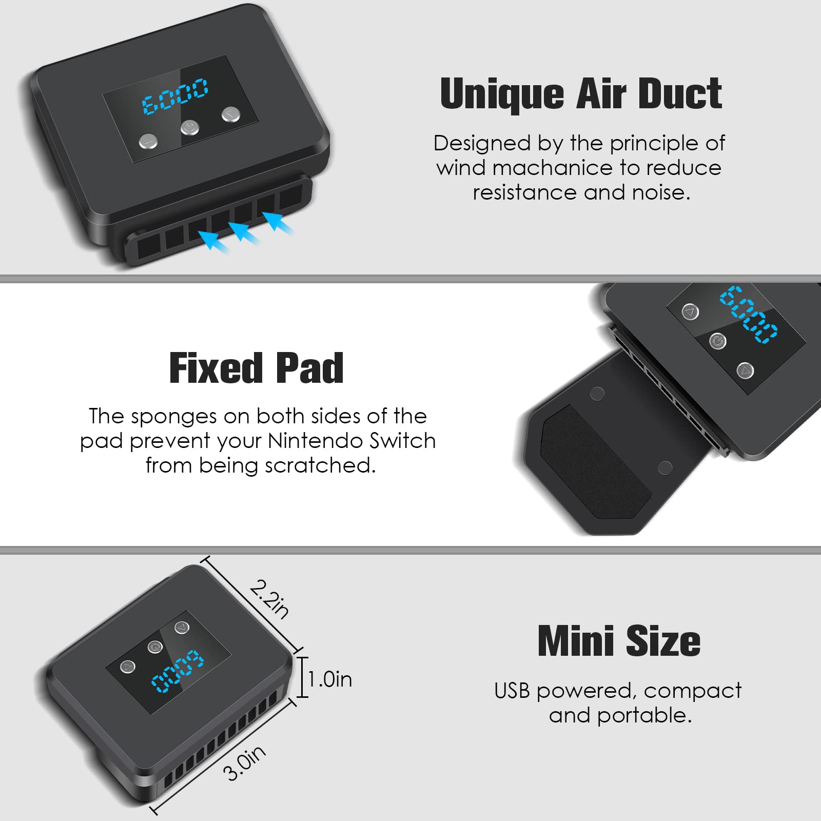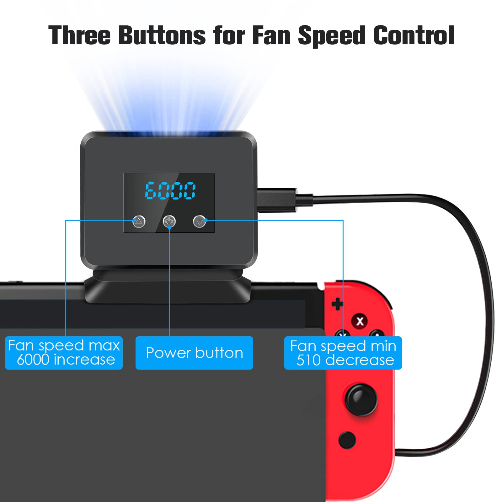 - ADJUSTABLE FAN SPEEDThe adjustable fan speed from min 510rpm up to max 6000rpm of the radiator for Nintendo Switch is perfect for heat-exhaust and ventilation. When the fan speed is under 2400rpm, it is nearly no noisy, unless the fan speed is above 2400rpm, it will produce some fan spinning sound.
