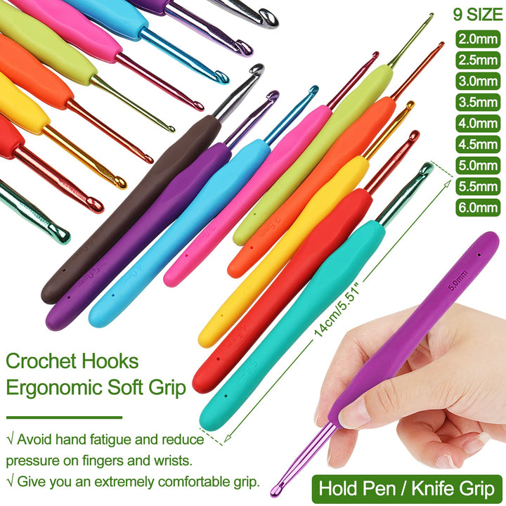 - [High Quality Crochet Hooks for Beginner] Ergonomic crochet hooks set with rubber and metal handles helps avoid hand fatigue and reduce pressure on fingers and wrists. The cushioned handle and lightweight crochet combine to give you an extremely comfortable grip. Even if you knit for a long time without feeling discomfort. If you are a beginner, you will no longer need to purchase other knitting supplies and accessories after purchasing. When you receive, you can start to enjoy crocheting