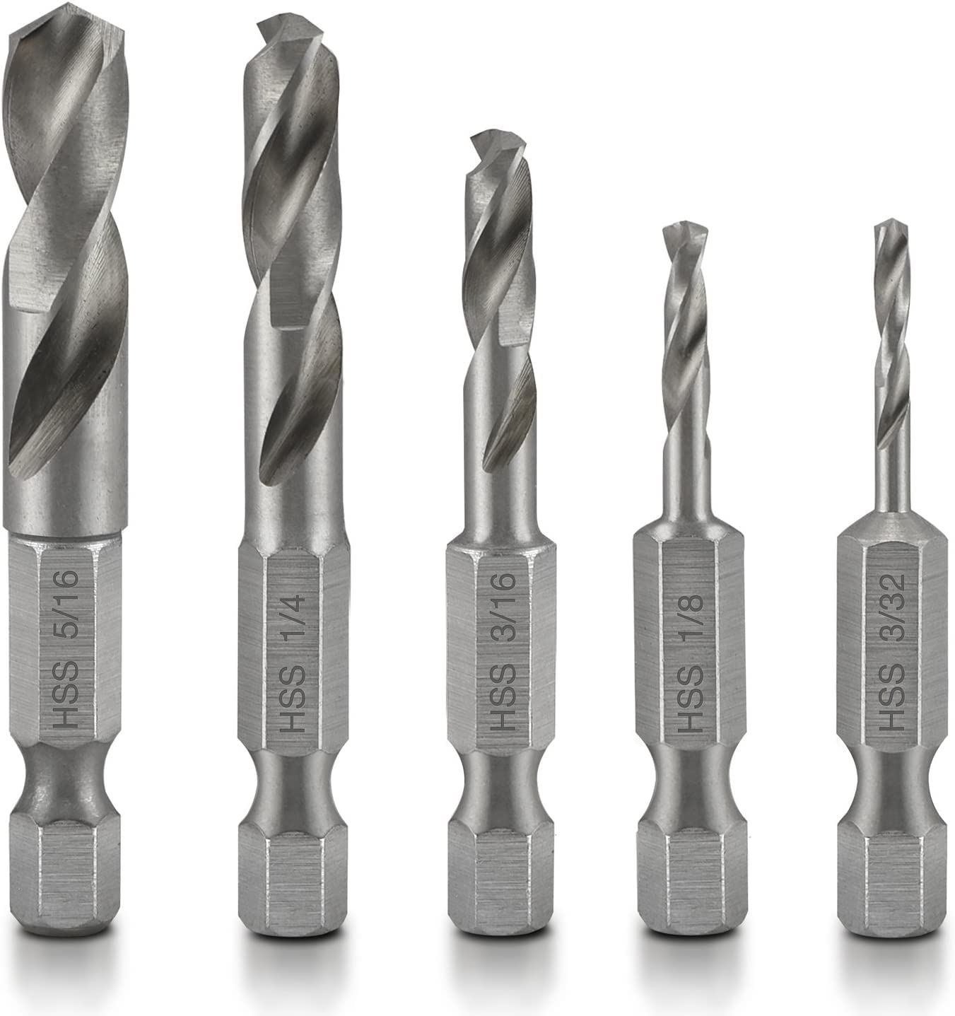 - The drill bit set includes 5pcs of drill bits in 5 different sizes to satisfy your demands: 3/32”, 1/8”, 3/16”, 1/4”, 5/16”. The drill bit set is more suitable for processing plastics and woods, it can be also used for hard metal.
