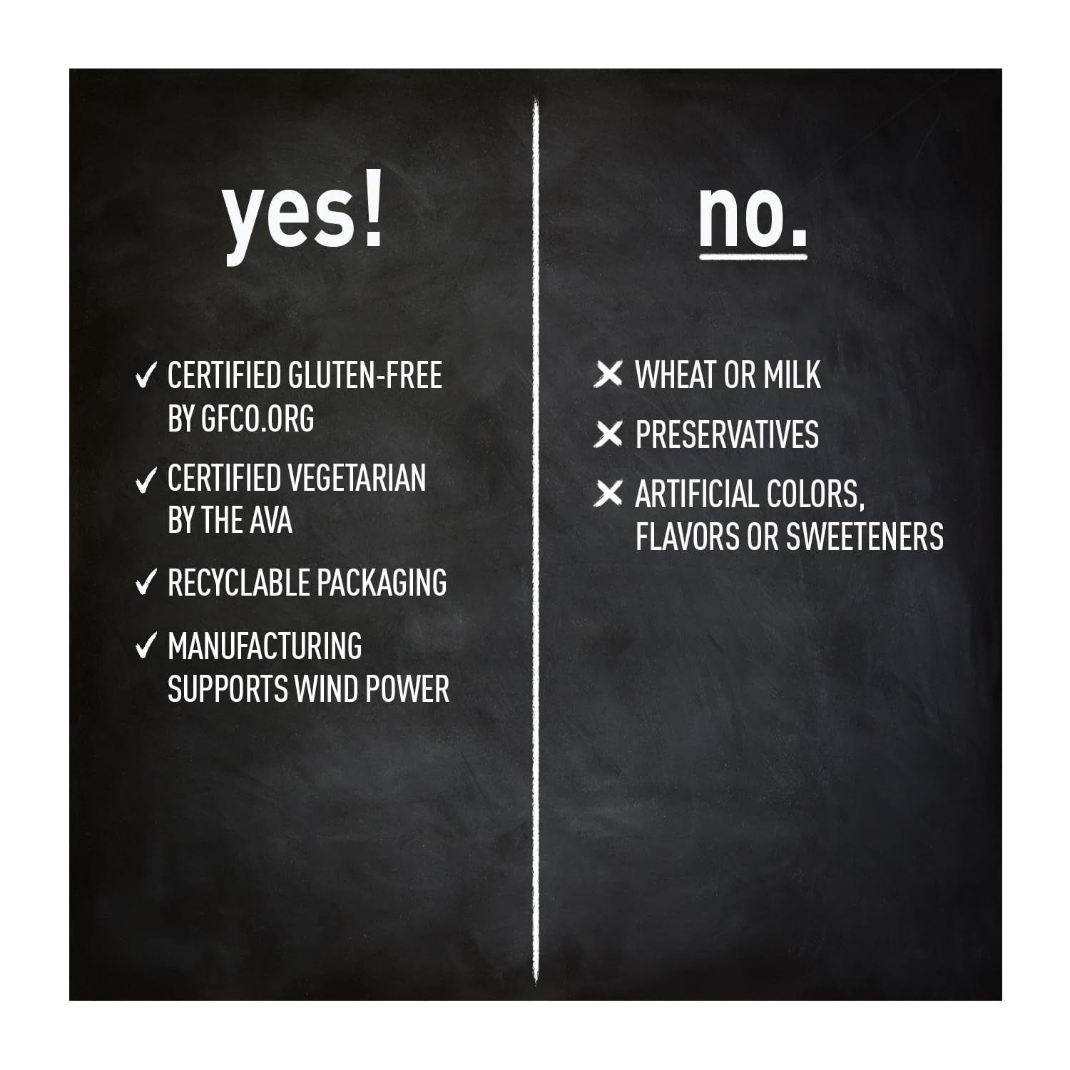 - CONTAINS ABSOLUTELY NO: Wheat - Soy - Milk - Artificial Color