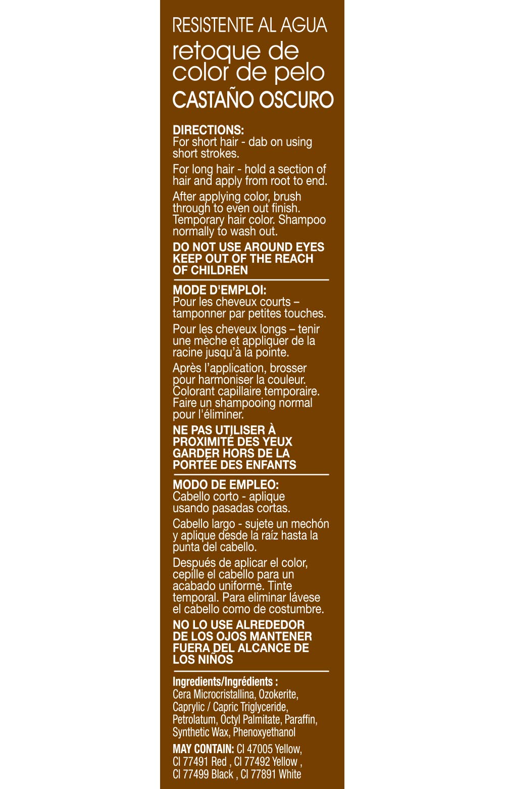 | directions | Apply with short strokes to gray roots at hairline and parting line. Comb hair after application to blend with existing hair color for a seamless natural look. Allow a few minutes to dry. Temporary hair color will wash out with shampoo in 3 shampoos. |