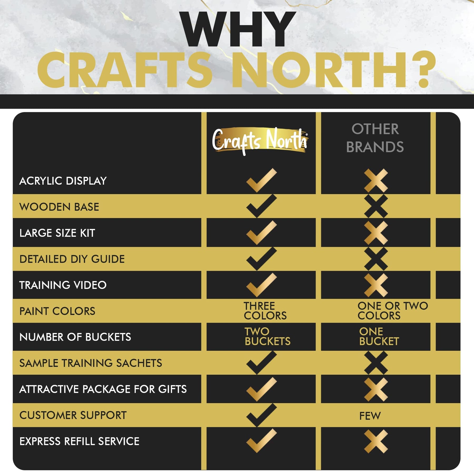 - All-Inclusive Set: The Crafts North kit includes all the tools, supplies, accessories and 6 x 6 x 7 acrylic display with 7 x 7 x 0.5 wooden base, needed to create a stunning statue: sample sachets which allow you to practice before making your official mold, two molding buckets, wooden display base, color paint, brushes, sandpaper, and plastic table cover sheet.