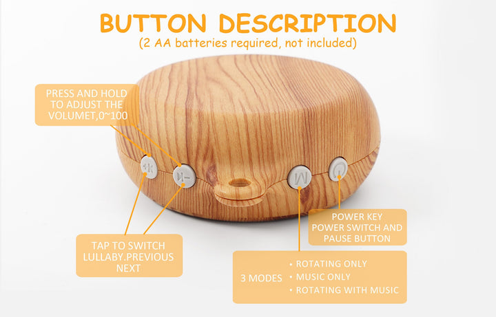 - MULTIPLE MUSIC: The music box plays 9 complete songs, including people singing. 9 songs play one after another in a circle, switch automatically. Compared with white noise, songs help babies relax faster. 2 AA batteries required, not included.