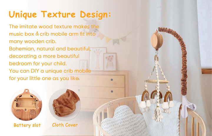 - UNIQUE TEXTURE DESIGN: IMITATION WOOD DESIGN - Including the crib mobile music box and crib mobile arm. It will be suitable for more baby mobile, such as wooden crib mobile, natural and beautiful, to decorate a more beautiful bedroom for your child.