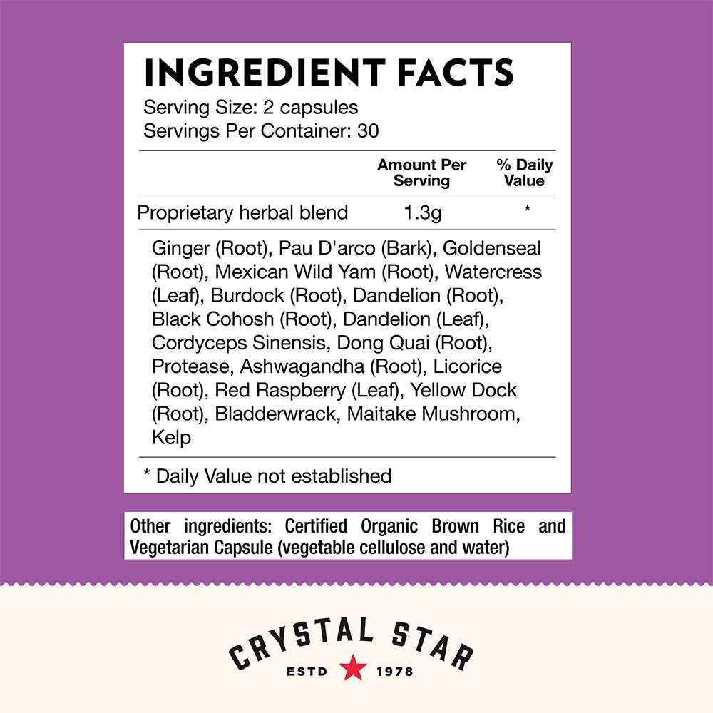 ingredients | Ginger Root, Pau D'Arco Bark, Golden Seal Root, Mexican Wild Yam Root, Watercress Leaf, Burdock Root, Dandelion Root, Black Cohosh Root, Dandelion Leaf, Cordyceps Sinensis, Dong Quai Root, Protease, Ashwagandha Root, Licorice Root, Red Raspberry Leaf, Yellow Dock Root, Bladderwrack, Maitake Mushroom, Kelp |