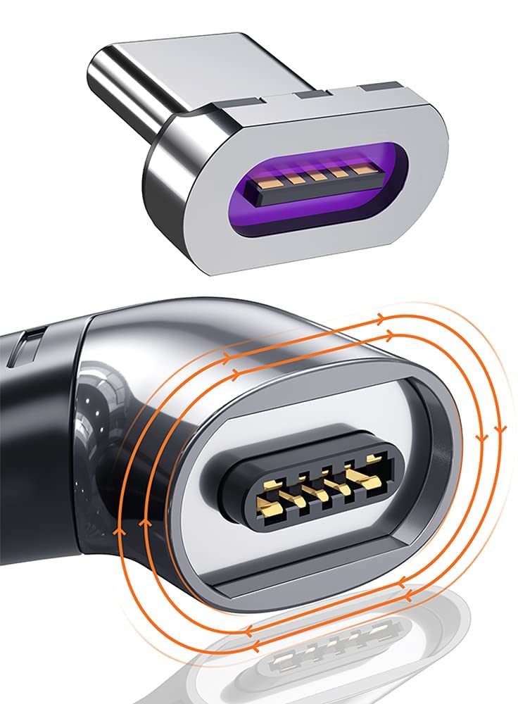 - (Upgrade Convenient Design)The USB C magnetic connector use Top-notch magnet, 5 Gold plated pins new design, aluminum housing and LED indicator. Automatic magnetic connection to reducing abrasion during inserting or pulling out the cable. And the right-angled design perfectly fits laptops and Cellphones, doesn’t block you from using the adjacent USB-C port. Its simple and mini can satisfy you to use two USB-C ports at the same time.