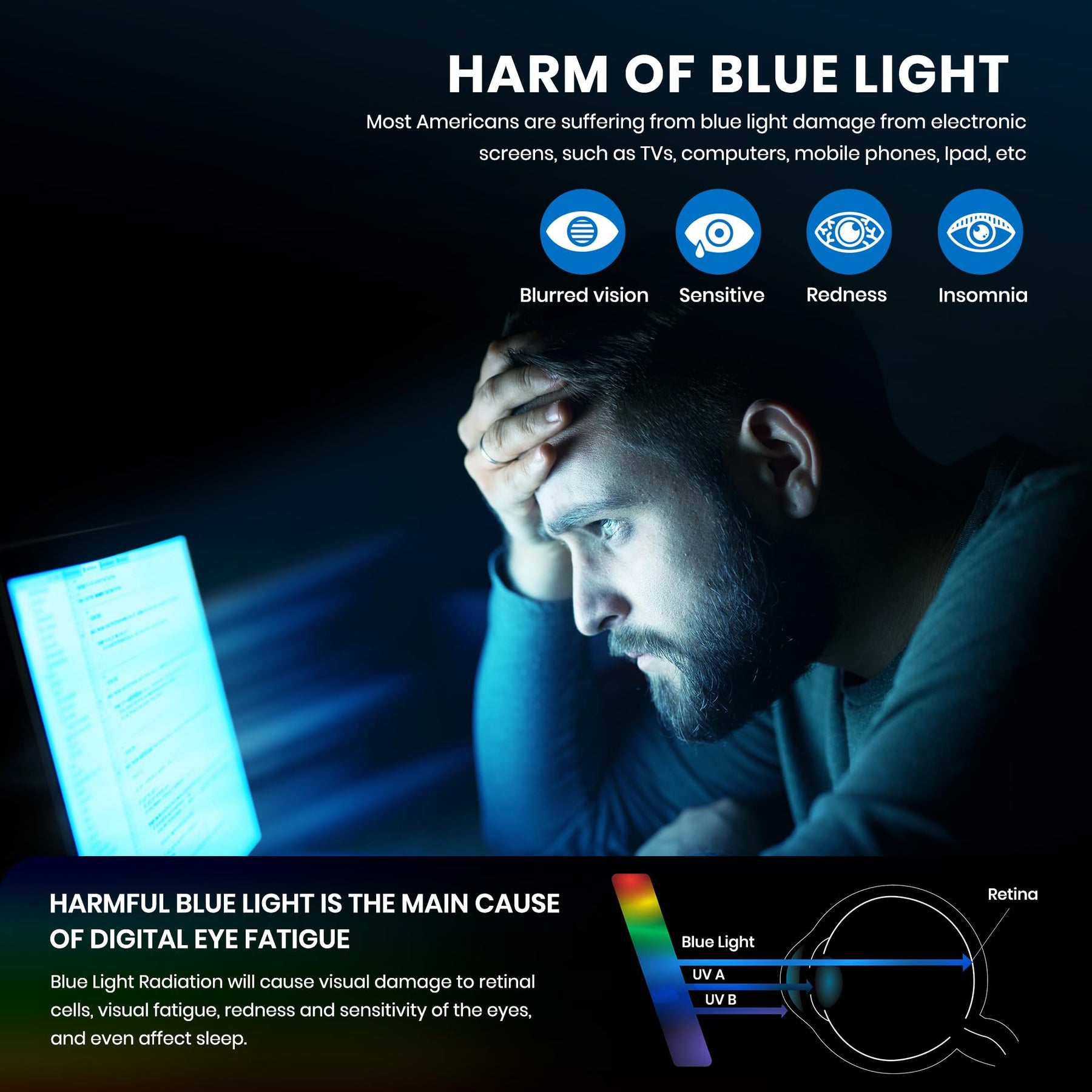 - COMFORTABLE TO WEAR: When you play on the computer or mobile phone, this anti blue light glasses can filter harmful blue light radiation to protect your eyes. It's lightweight and comfortable to wear.