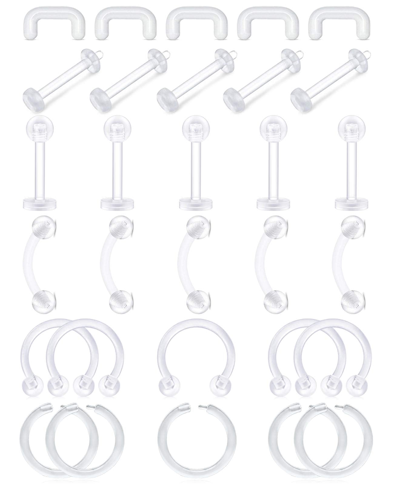 - [Total 30pcs] * 5pcs clear lip rings, * 5pcs U shape septum retainer, * 5pcs clear cartilage earring, * 5pcs horseshoe hoop earring retainer, * 5pcs clear eyebrow rings, * 5pcs clicker nose retainer